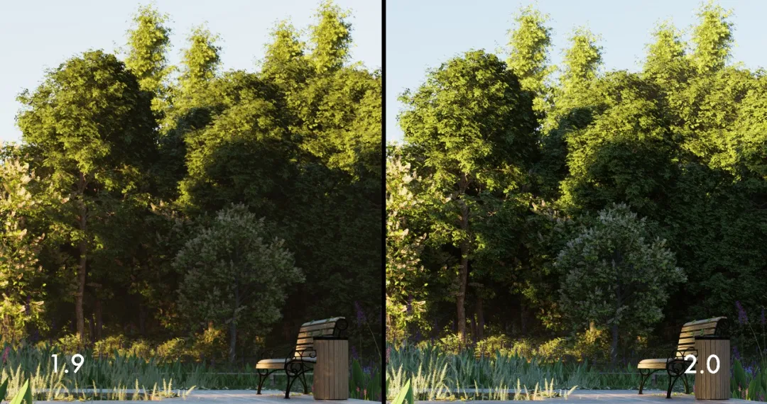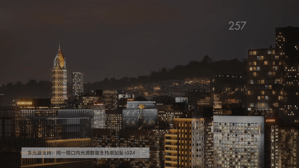 大幅优化了多光源场景的性能,同一视口内,人工光源和自发光源数量最多可达1024个。纯光源场景实时流畅度提升1~4倍,视频输出速度提升最多可达90%,超多光源场景不再卡顿。