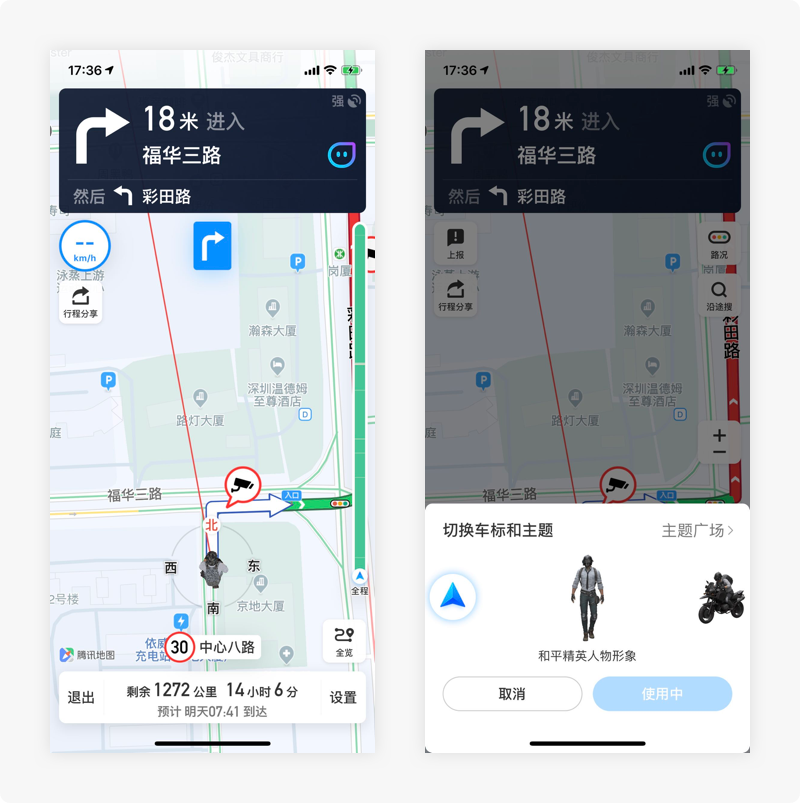 腾讯地图APP通过趣味化的方式在导航车标上加入了各种主题,通过下载自己喜欢的主题切换后,地图上原来的车标就会变成自己喜欢的形象。众所周知,腾讯游戏是整个行业中不可逾越的一座大山,在众多主题里,「和平精英」「王者荣耀」的形象就是用户最熟悉的。用户可以选择游戏人物角色、摩托车、卡丁车等作为地图导航中的车标。可以想象,骑车摩托车、安吉拉用着疾跑、开着卡丁车在地图上狂奔是一种什么样的感觉。腾讯团队通过整合各种现有资源作为主题,给用户创造了既然趣味又个性化的体验,带给用户惊喜以增强用户粘性。