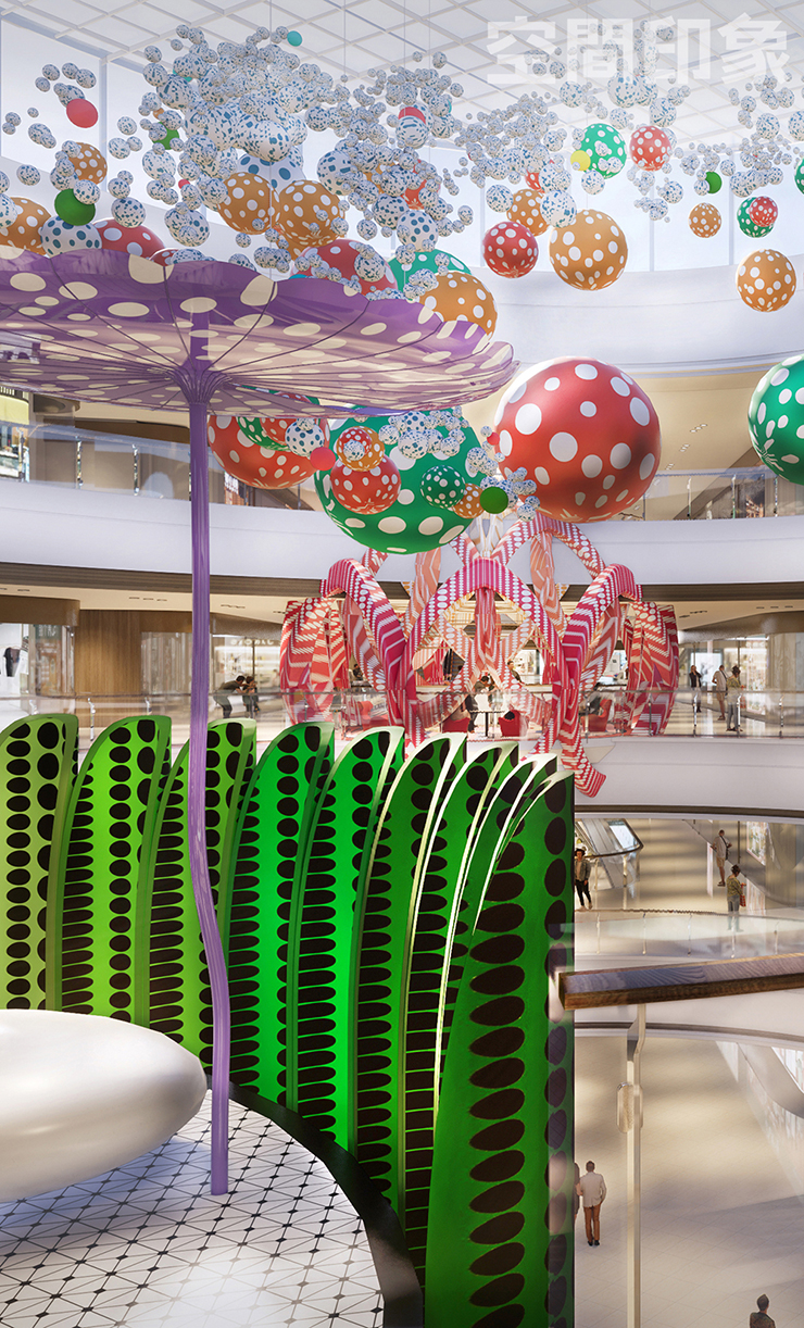 变幻的波点、鲜亮的色彩、无限制的构图都让草间弥生笔下的波点拥有巨大的魅力。我们希望借助这样的视觉效果让原本平平无奇的空间变得生动有趣,让物理上有限的空间在思绪上得到尽情扩大,为贵港的小朋友甚至大朋友呈现一个新的游乐空间,创造一个超chic的波普世界。