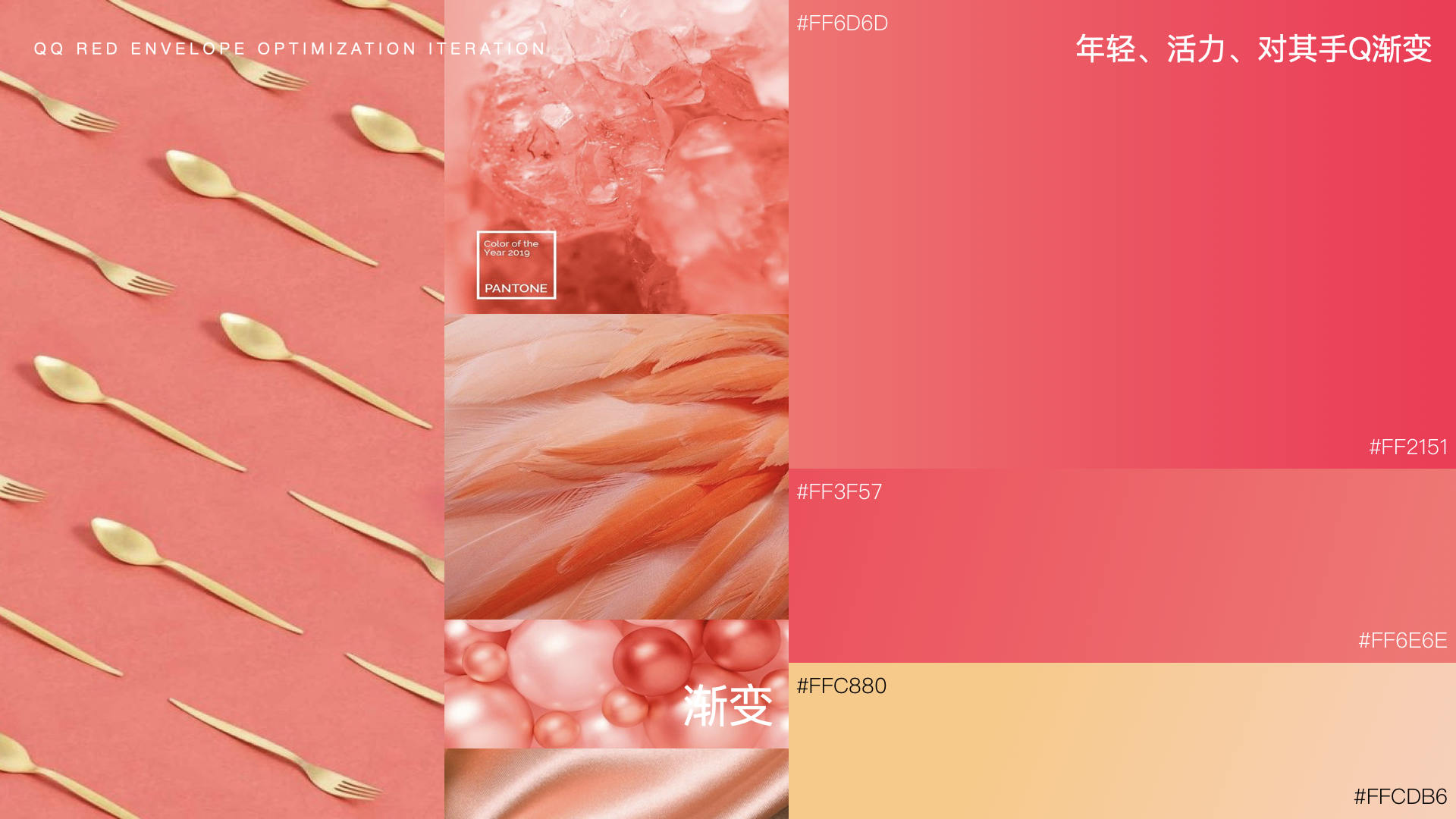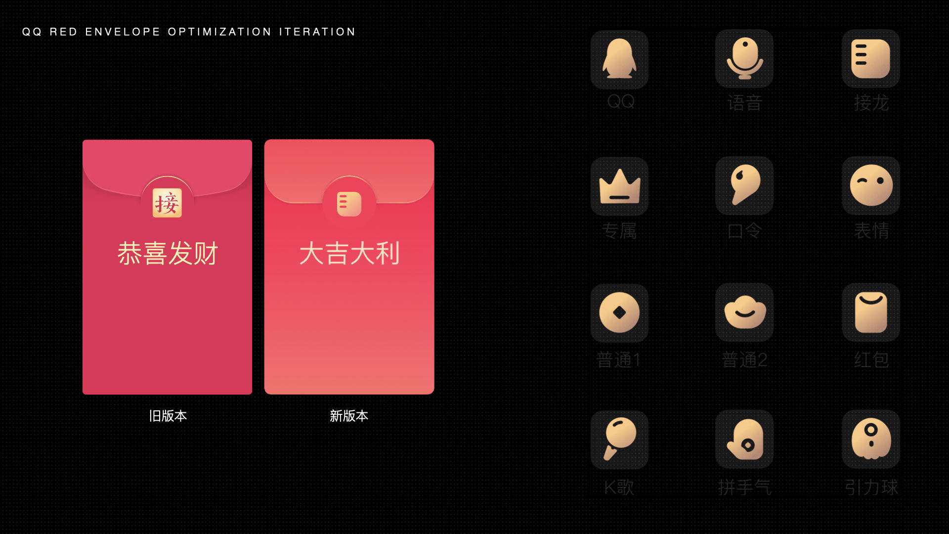在选色上,对齐手Q渐变色,找到更流行活力且适合用户群和红包的珊瑚红;并针对原本复杂多样的icon,做统一性规划。