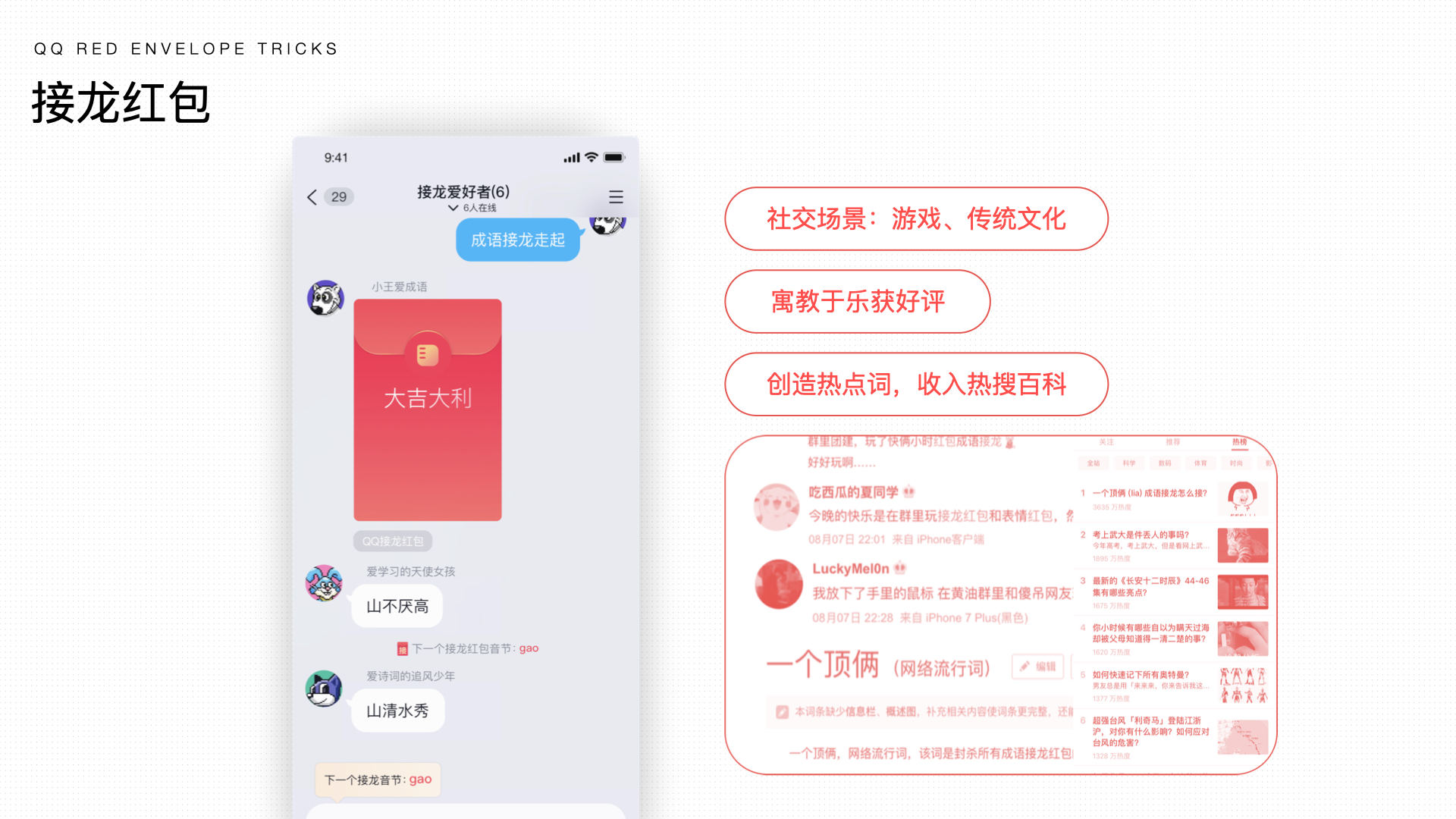 持续创造【接龙红包】加入传统文化结合游戏的社交场景,用红包结合寓教于乐的成语接龙玩法,课堂上使用接龙红包进行教学获得了师生们的好评;并创造热点词“一个顶俩”收入百科,同时登上知乎热榜第一。