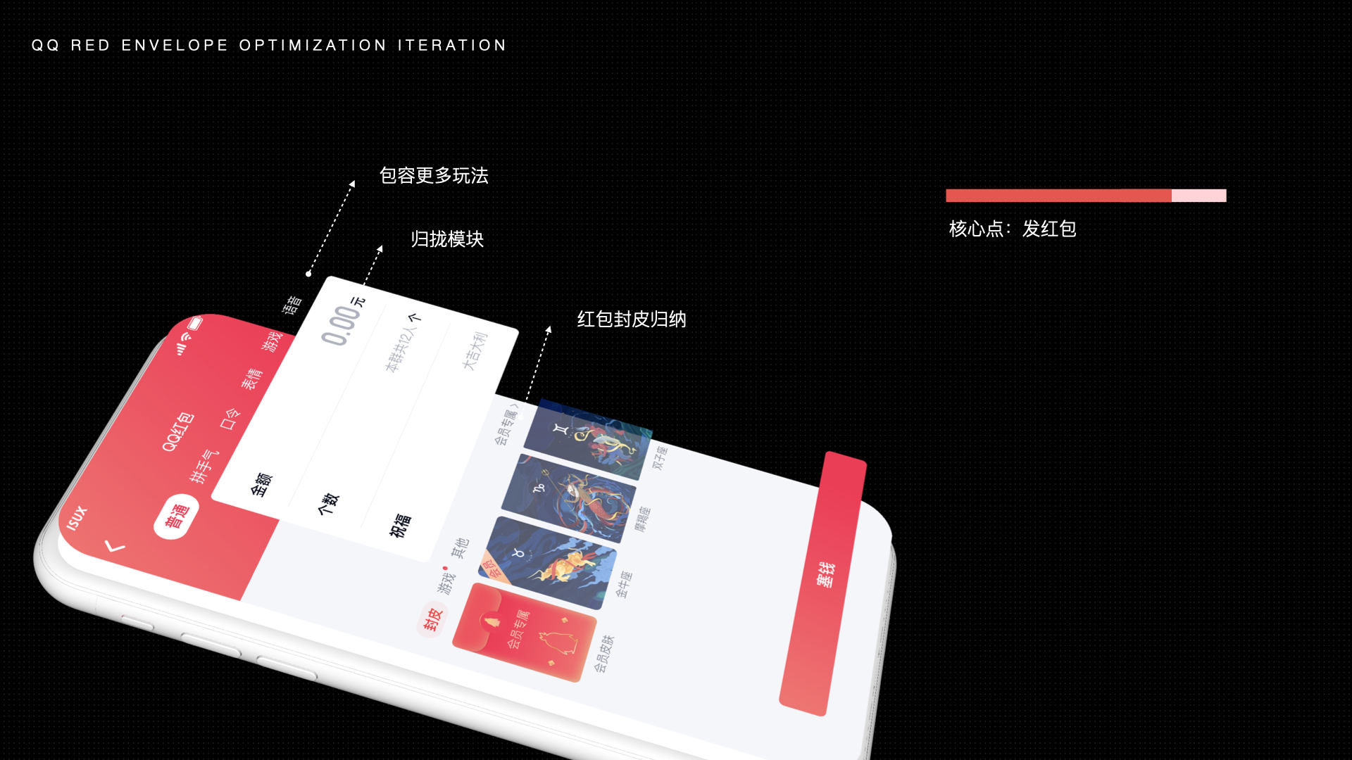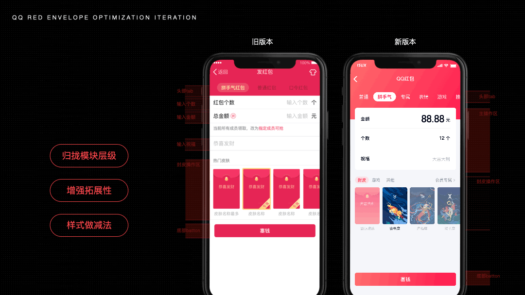 首先发红包页在样式上尽可能做减法,不增加用户理解成本。基于核心点是发红包,做金额突出、层级简化来保证体验。并发挥拓展性,包容更多玩法和封皮归纳。和之前版本对比,归拢模块的层级、增强拓展性。固定主操作区,延展副操作区,便于介入更多新玩法。