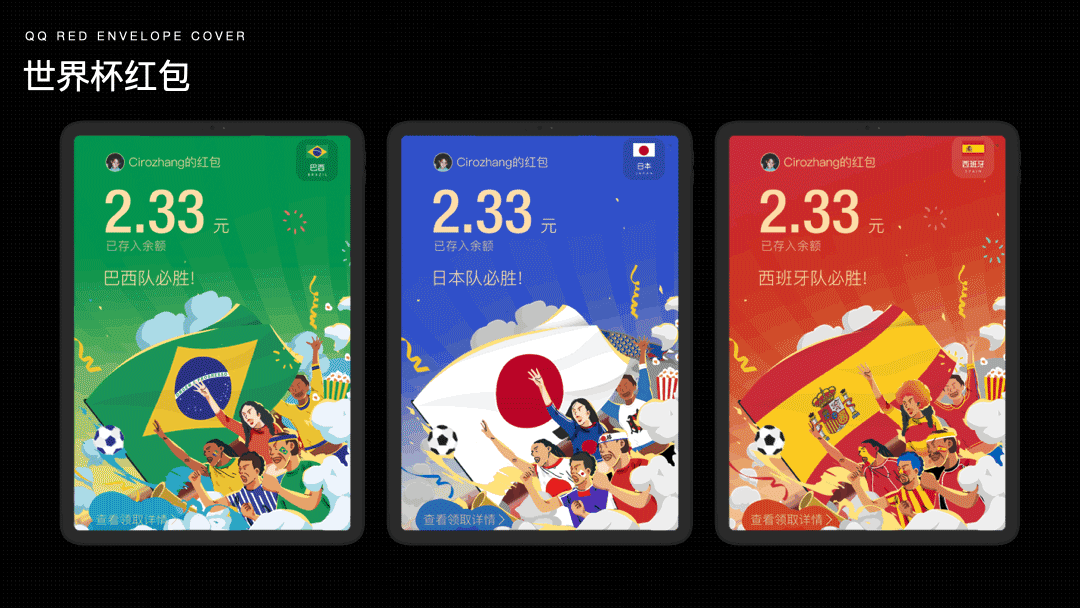 为了让用户拥有更好的体验,世界杯阶段,我们还特别制作了绝版冠军封皮,加入动效增强以及金色卡片增强尊贵感,传达诚意的同时,提升用户参与度。