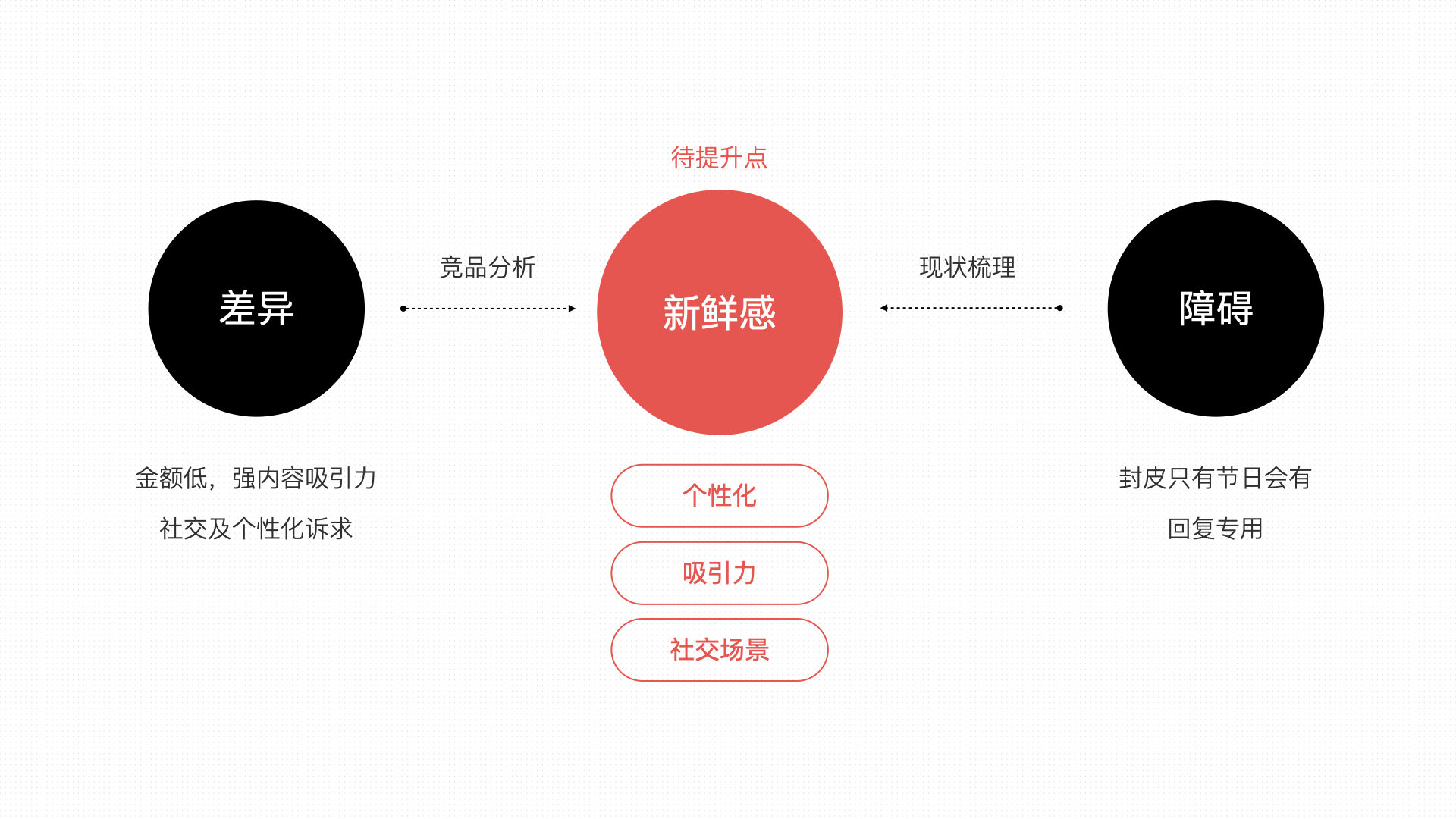 我们对现有运营进行分析后发现了问题,目前现有封皮只针对节日推出,形象以QQfamily为主比较单一;现有玩法很久未更新,口令红包已成群里回复专用红包,使用场景也有限制。再和竞品及现有障碍梳理后发现:与竞品比,用户有更强的社交及个性化诉求;且年轻用户金额大部分都不大,需要更强内容吸引力。