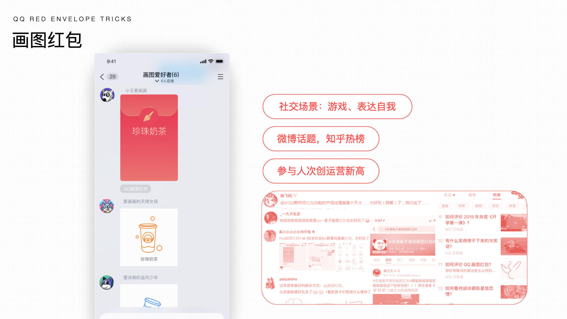 QQ最新版本上线了多种红包玩法及红包封皮火遍全网…接龙红包曾创造热点词“一个顶俩”收入百度百科,登上知乎热榜第一;画图红包、红包封皮等也有大量网友参与讨论…那么QQ红包作为OG产品如何保持活力,如此有趣的红包社交又是如何设计出来的?