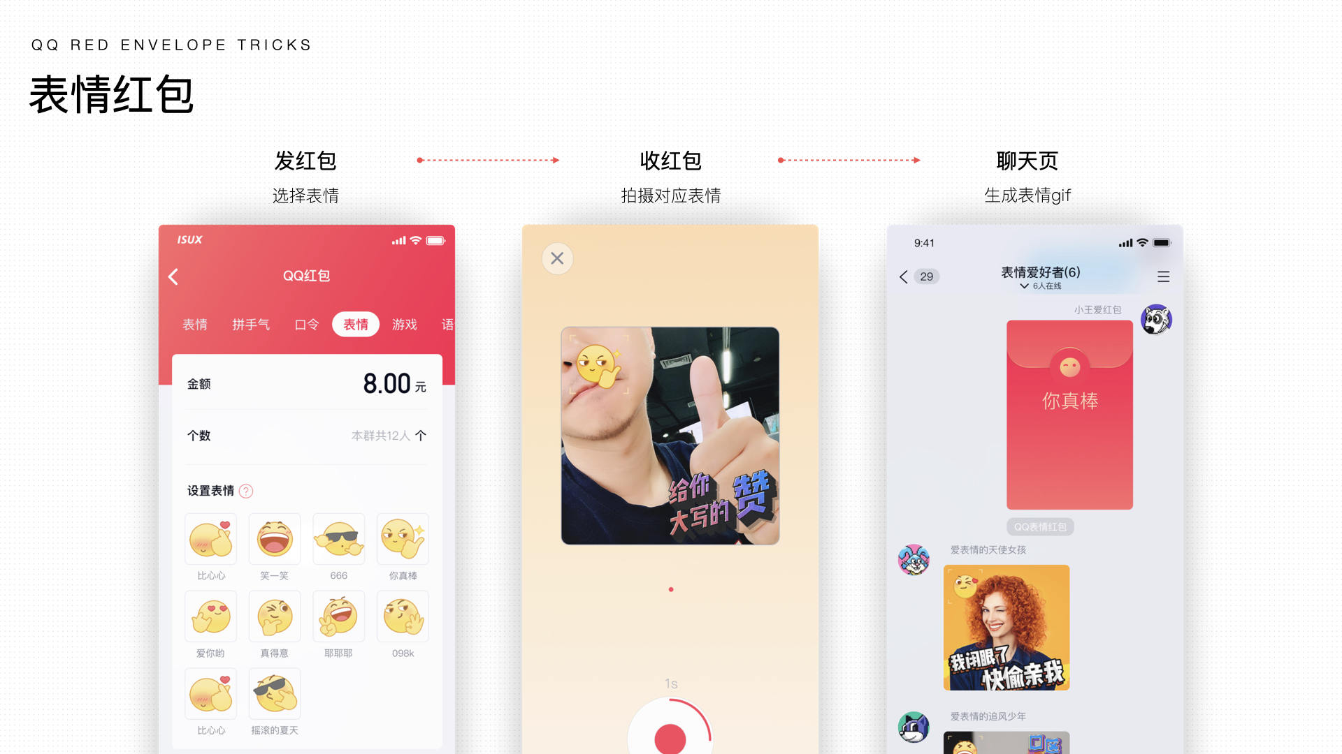创造【表情红包】,找到年轻人社交场景中的“斗图”和“表达自我”,用户在发红包时选择表情,在收红包时拍摄对应表情即可领取对应的红包,聊天页对应生成好友的表情包gif。设计结合易用性、遵循体验及趣味拓展,保证玩法与红包基本体验相结合。