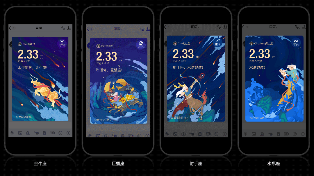 首先从红包封皮入手,抛开原有限制,挖掘年轻人的社交场景。在众多场景中找到【星座】作为突破口,因为星座面对群体广,使用场景广,更易和用户自身建立关联。