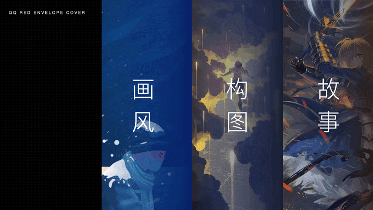 首先画风参考西方魔幻+史诗情节、风格更加新颖轻巧、适合QQ红包的整体质感,更加符合年轻人喜爱的风格、也满足绝大部分的观感;构图则采用大小、明暗对比,形成画面冲击力;并且为每张画面制定一个故事。