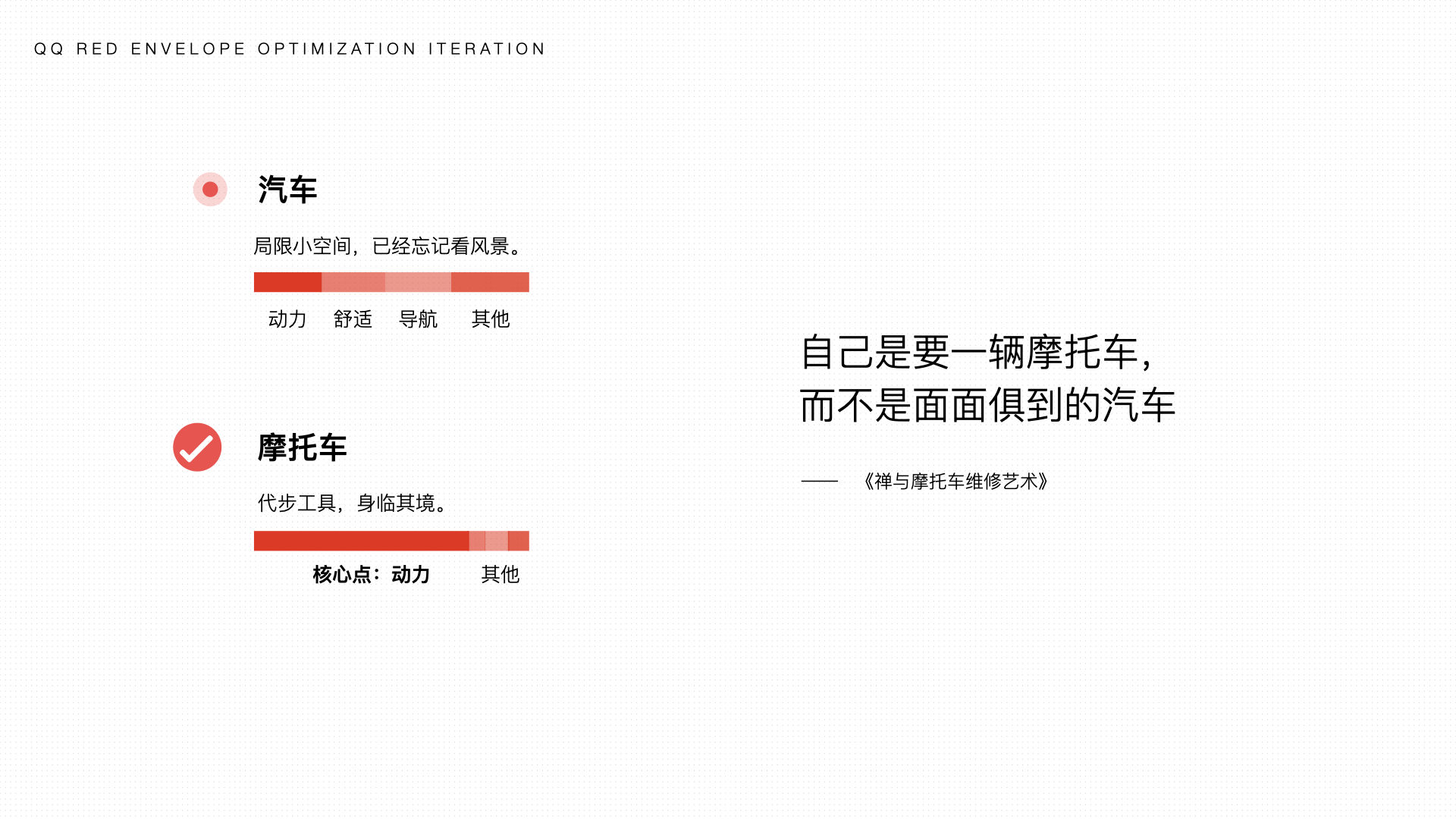 红包的核心还是需要优先考虑效率体验,如果每个环节都想突出趣味性会导致信息层次的干扰,有时候更需要一辆以动力为核心,其他做减法的摩托车,而不是面面俱到的汽车。