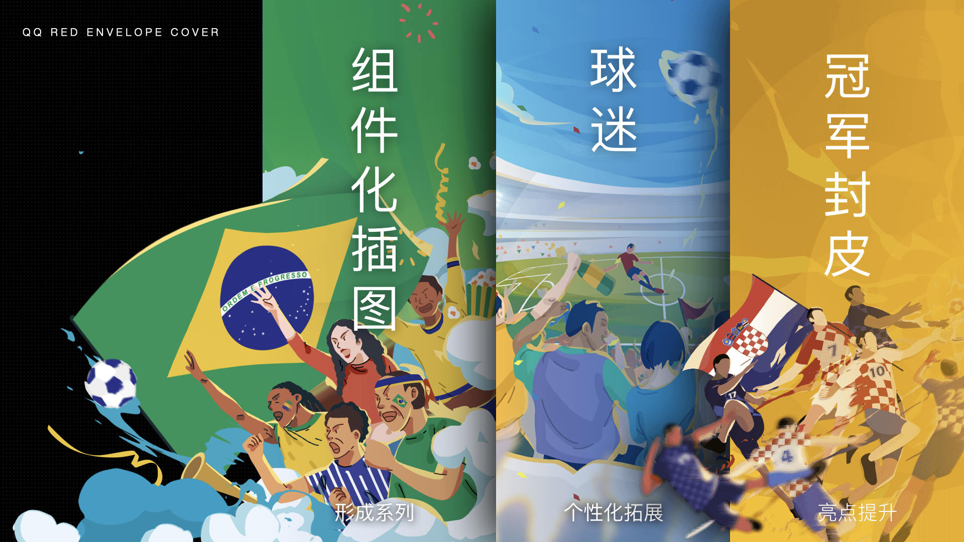 先选定风格、配色,找到有代入感的“球迷”进行拓展,随后进行组件化插图及亮点提升;根据组件化插图,固定国旗、人物、场景组件,替换相应的皮肤、应援服、装饰等。