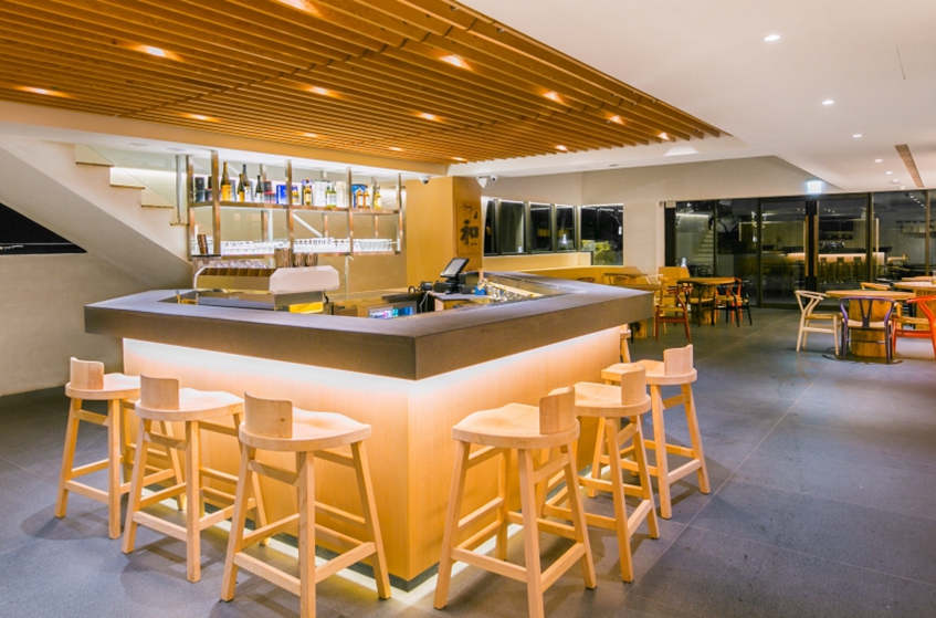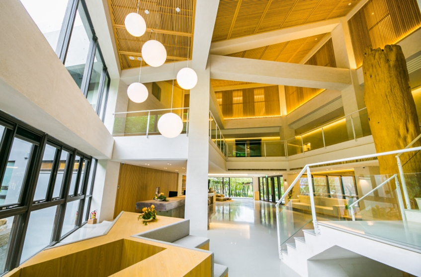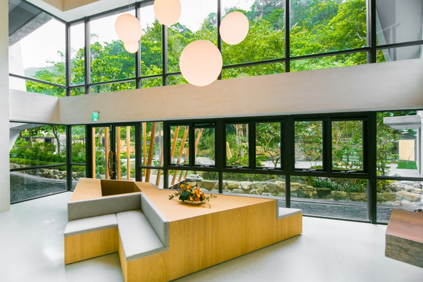 前后总共分为两栋,走进挑高且开阔的接待大厅,大面积的玻璃幕墙洒落丰沛日光,成为很暖心的迎宾招呼,并以木格栅包覆天花,并植入日式山水造景意象,且竖立创办人的心爱收藏台红桧,让一切动静都洋溢芬芳木香。