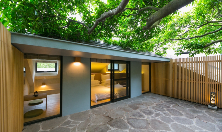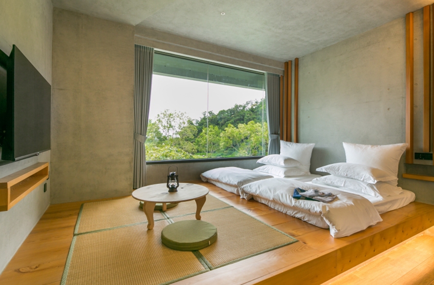 前栋泡汤套房以新型态的日式禅风为主,选用桧木交织清水混凝土延续纯净本色,不需远赴日本京都泡汤,在此便可浸沐道地的雅致和风。