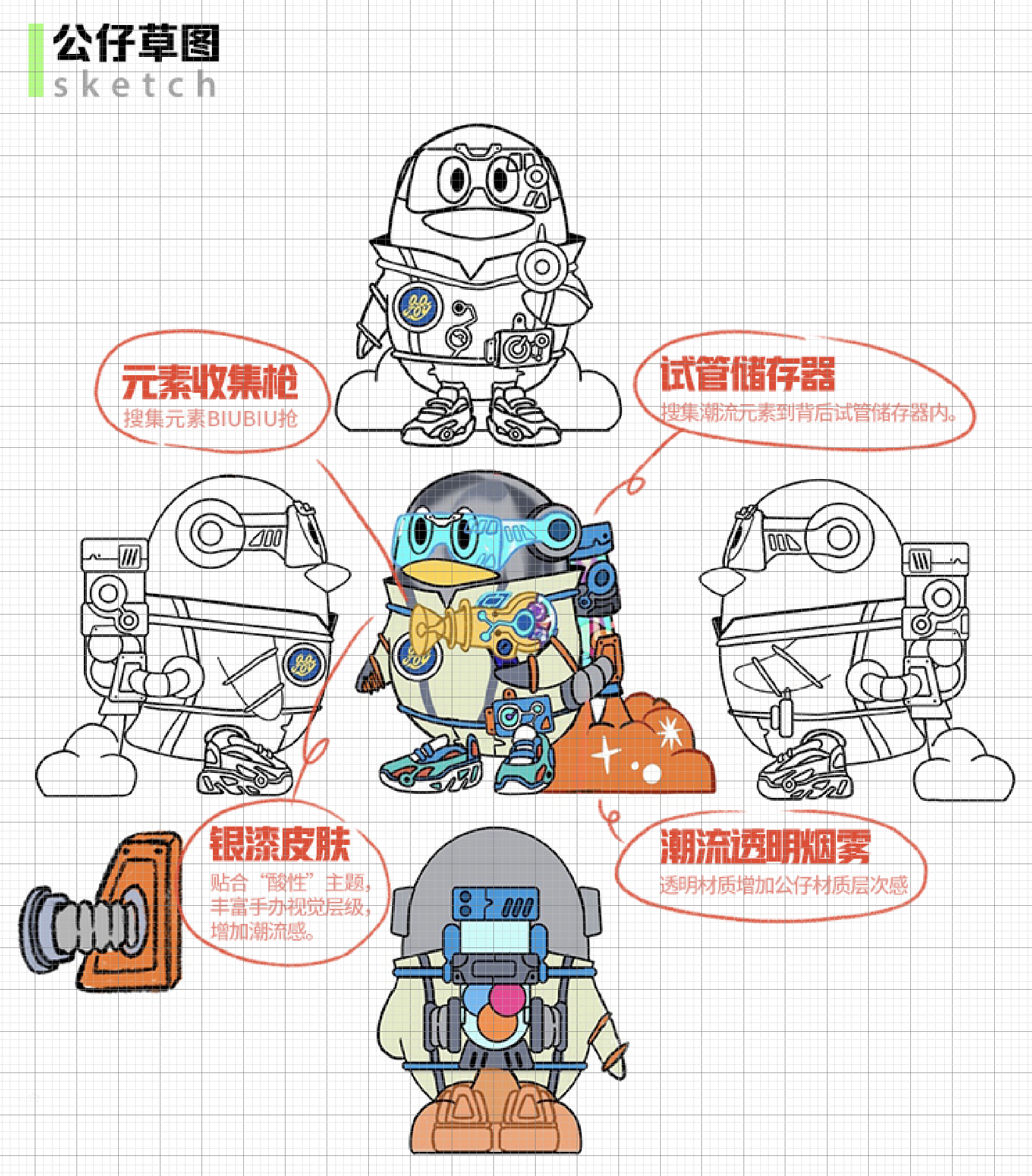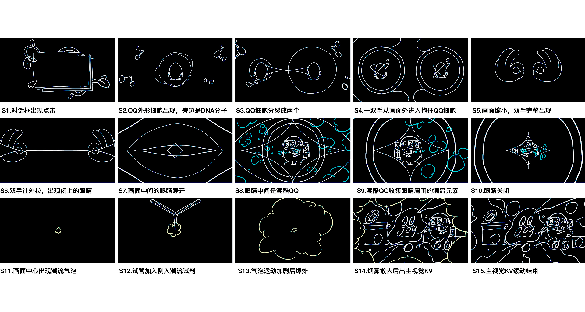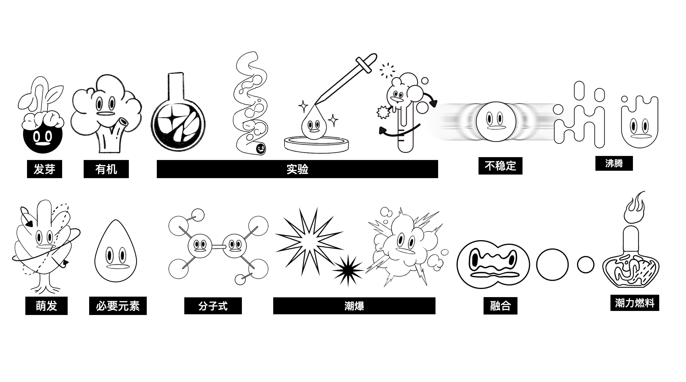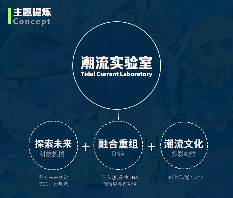 勇于创新和探索精神一直是QQ的主旋律,QQ化身一名探索者,对科技和潮流文化不断的探索和开垦。QQJOY是各色品牌潮流文化的聚集地,不同的潮流文化就像不同的化学分子,注入了QQ的品牌DNA后,通过分裂,碰撞,融合,掀起全新的时尚浪潮,碰撞出不同的品牌火花,初步设定潮流实验室是本次的设计理念。