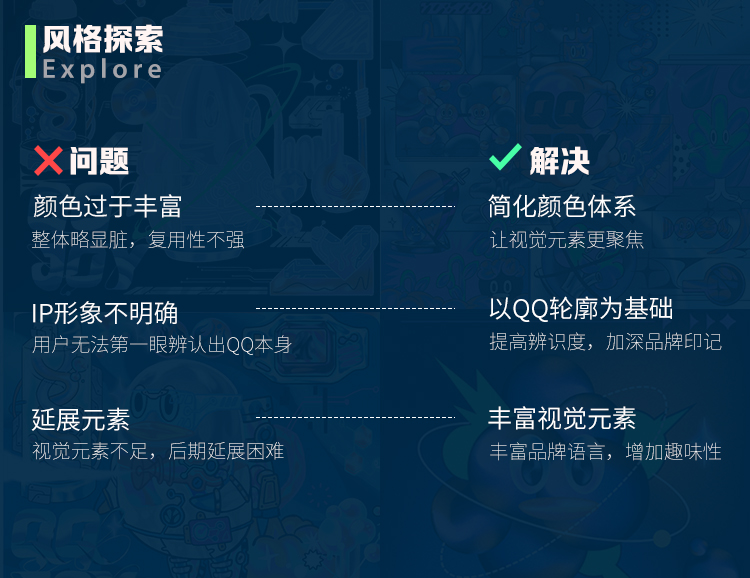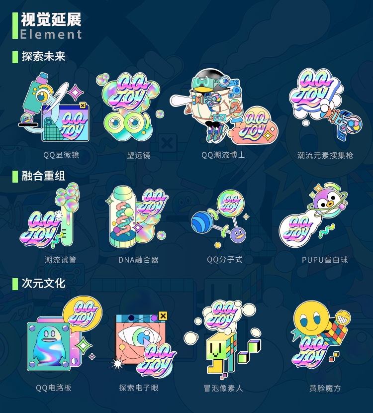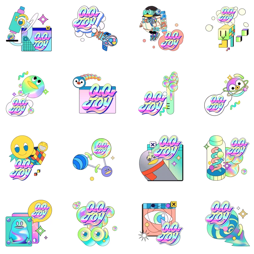 我们从“酸性设计”中提取关键词,进行图形提炼和提取设计语言,突破性的视觉风格也寓意着QQ勇于探索的精神。