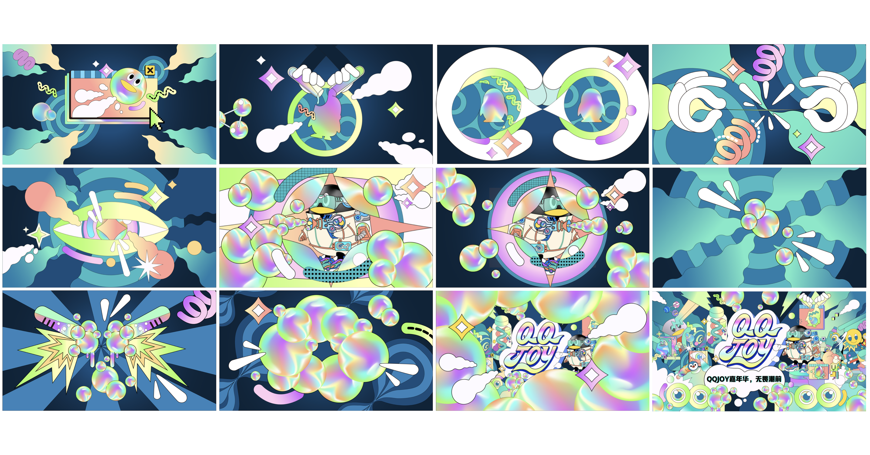 所以几经斟酌,元素总体还是以清晰的QQ轮廓为原型进行不同的视觉延展,颜色方面,以简单的渐变和局部形变来表达酸性的感觉。