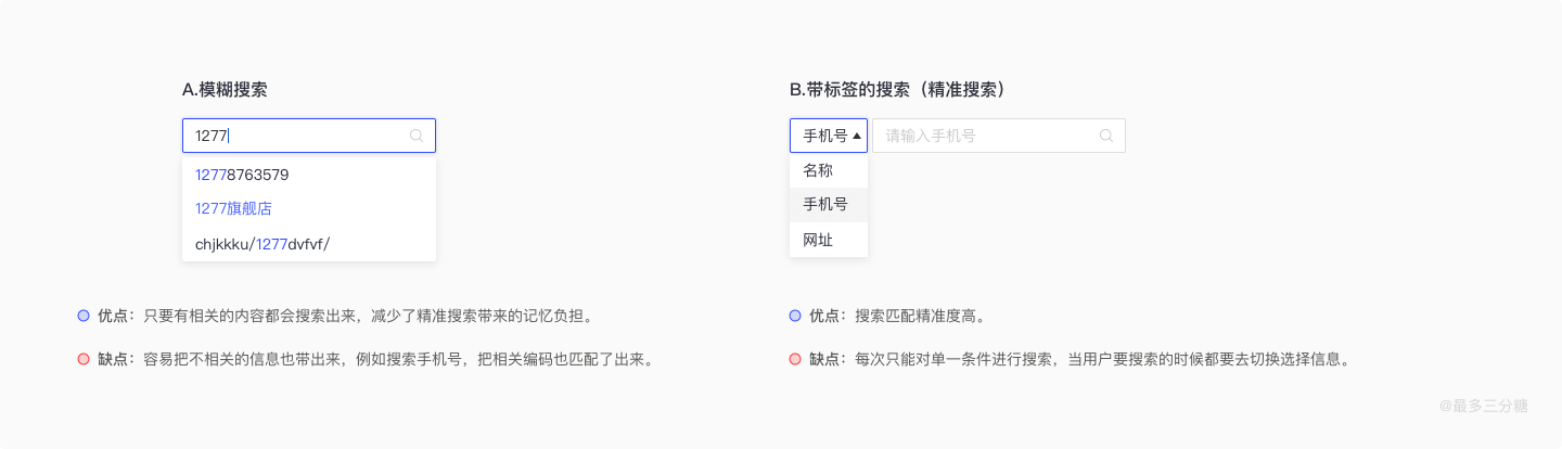 搜索可分为模糊搜索和带标签的搜索。工作中常用的搜索为模糊搜索,优点是只要有相关的内容都会搜索出来,减少了精准搜索带来的记忆负担。缺点是容易把不相关的信息也带出来,例如搜索手机号,把相关编码也匹配了出来。带标签的搜索优点是搜索匹配精准度高。缺点是每次只能对单一条件进行搜索,当用户要搜索的时候都要去切换选择信息,多了一个步骤。另外,在实际工作中,可以通过埋点或者调研,如果搜索框搜索手机号频率较大,我们可以把手机号设置为默认选项。