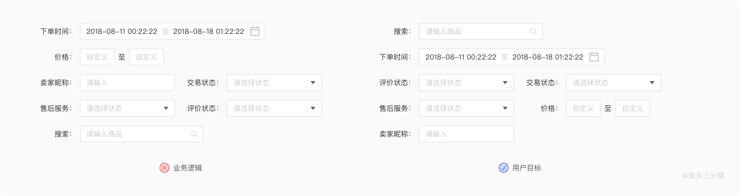 当筛选项过多时,信息排序应是用户目标优于业务逻辑,即排序应该考虑用户的使用习惯。例如当用户查找订单时候,第一反应都是搜索框输入,而一般通过价格过滤较少的应该放在末尾。