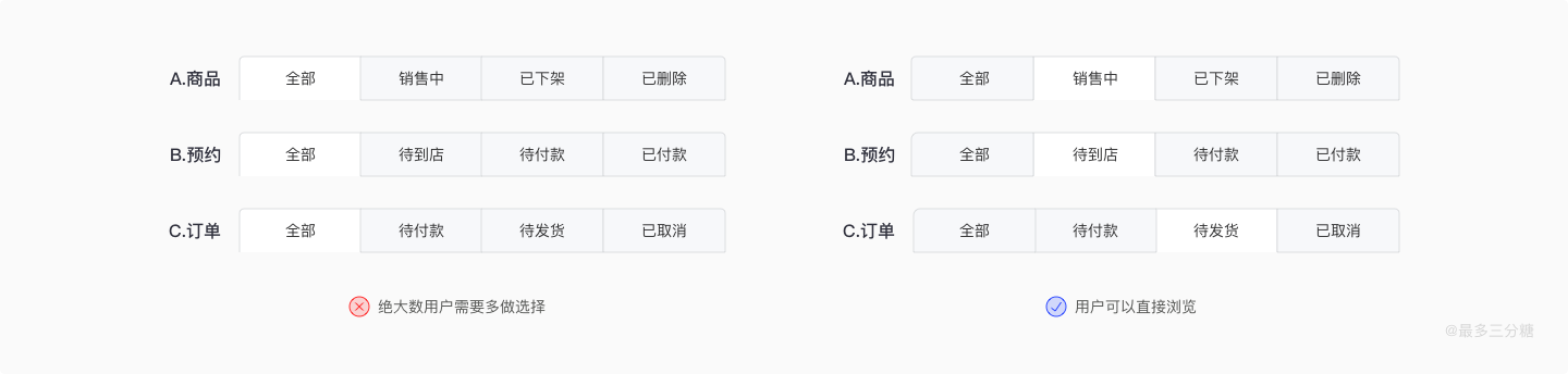 同样我们也可以通过数据埋点或者调研,将用户最关注的选项设置为默认选项,减少用户的选择,提高用户的体验。例如下图,用户更关注的是销售中的商品,将要到店的客户,以及即将发货的商品,所以我们将这些选项作为默认项。