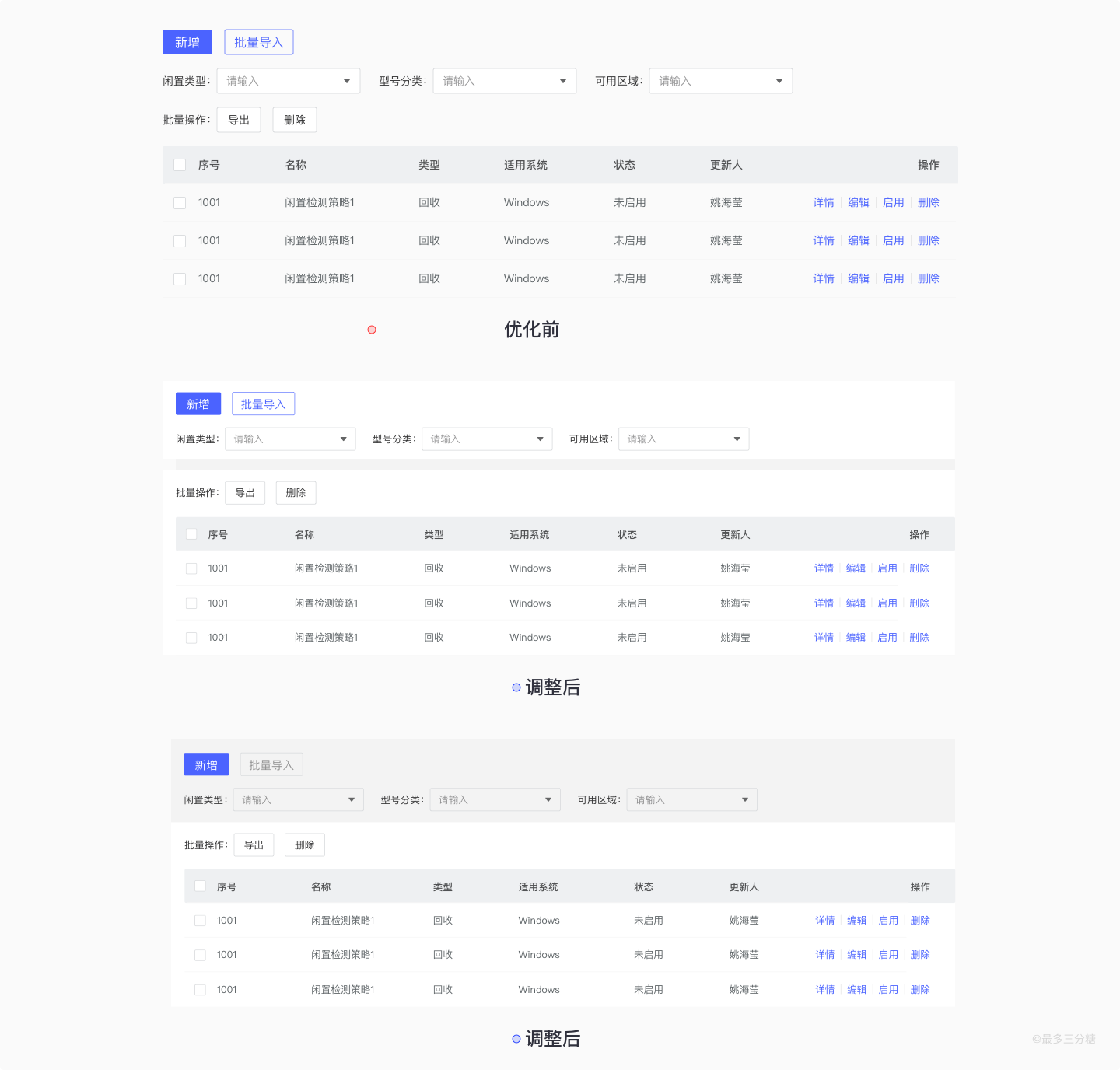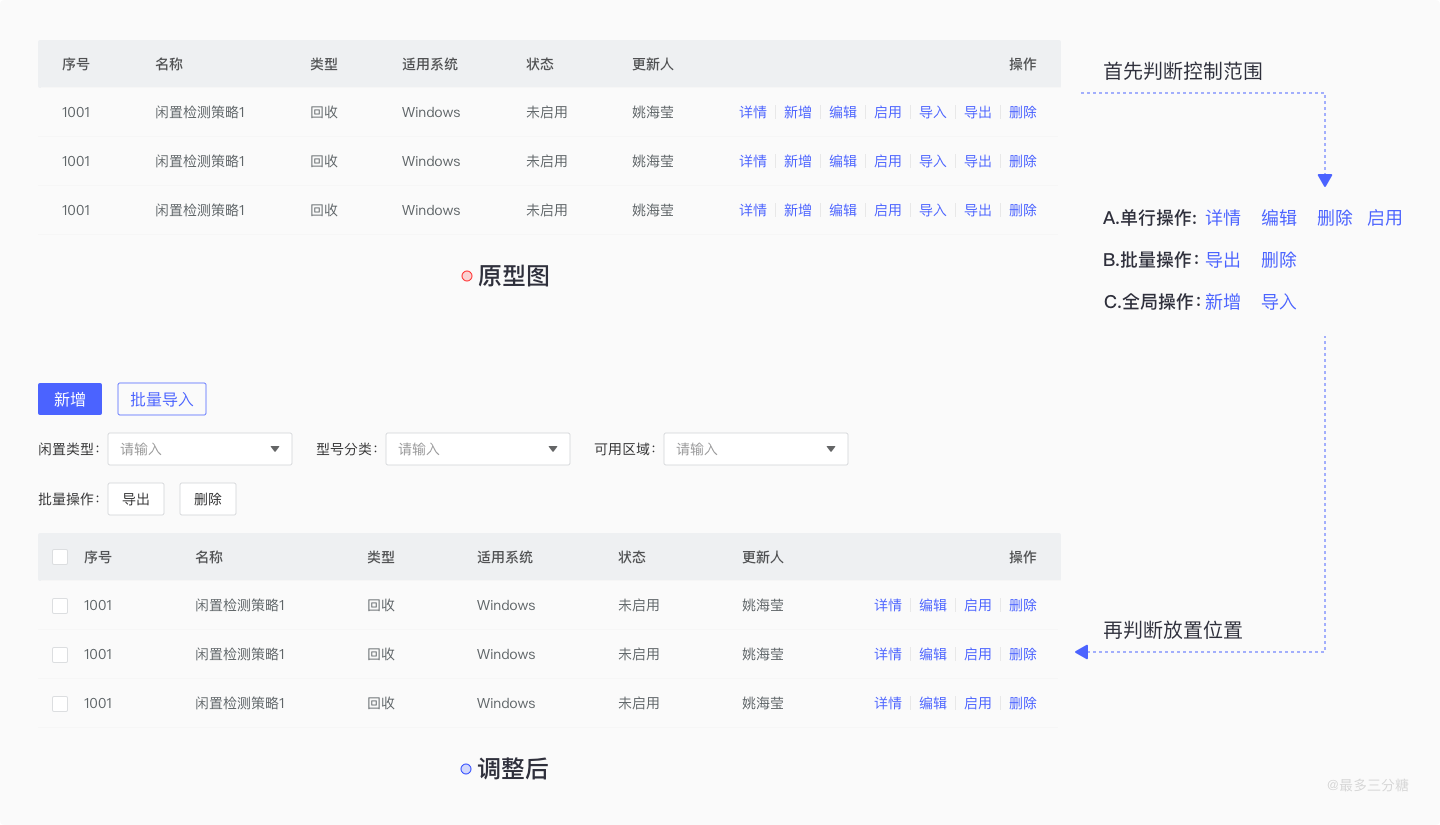 当从产品那里拿来一个原型图堆叠很多操作项,我们就可以根据控制范围来区分判断,从而明确摆放位置。单行操作可以放到表格里,批量操作根据亲密性原则放在左上方,这样可以离打勾矩形近一些,如果有利于用户操作,也可以放在左下方。全局操作则可以放单独一行,使得层级更加清晰。