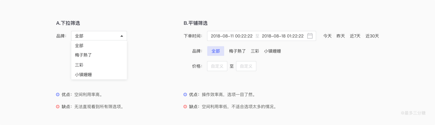 筛选框可以分为下拉筛选和平铺筛选。下拉筛选的优点是空间利用率高,起到了很好的收纳作用。缺点是无法直观看到所有筛选项。平铺筛选优点是操作效率高,筛选项一目了然,支持输入更多筛选条件,可以自定义输入。缺点是空间利用率低,不适合选项太多的情况。如果用户点击其中一个选项概率最多,我们就可以将点击率高的一项作为默认项,然后选择第一种下拉筛选框。如果用户点击每个选项概率相等,在空间允许情况下我们可以平铺出来。