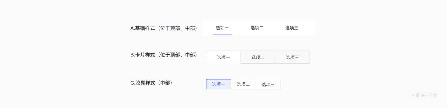 标签页是比较常用的数据过滤方式,它的切换样式包括基本样式、卡片样式以及胶囊样式。一般和时间、状态的流转有关。