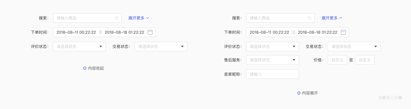 当然,我们还有更多优化空间,当筛选项过多时,我们可以默认折叠低频筛选项。折叠哪些筛选项还是得基于用户习惯,可以通过数据埋点或者用户调研得到用户使用场景。