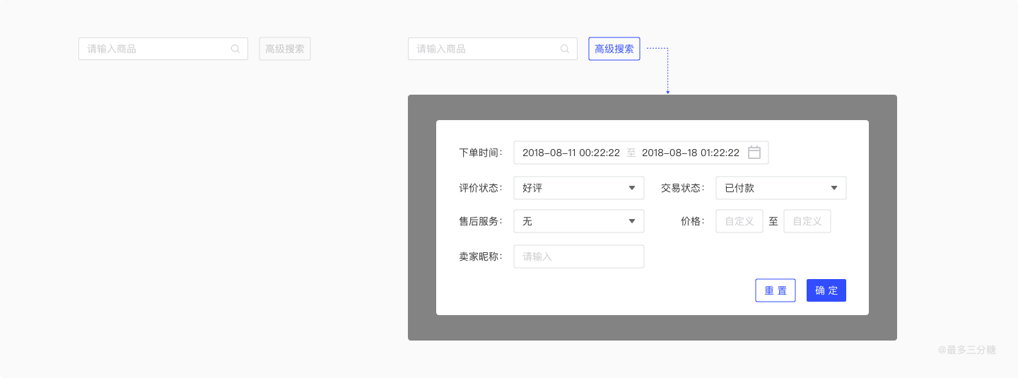 当通过数据埋点或者用户调研发现绝大多数用户只需要用到搜索项,那么我们就可以只保留搜索框,其他选项全部折叠到高级搜索里面,当点击高级搜索时候出现一个弹窗,既可以保留更多筛选内容,又可以使页面不会看起来很拥挤。(当弹窗内容选择完毕时候,高级搜索按钮会呈现高亮颜色,未选择更多筛选内容时候则呈现默认态。)