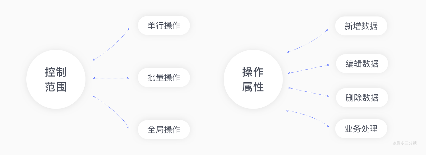 数据操作从控制范围可以分为单行操作、批量操作和全局操作。从操作属性可以分为新增数据、编辑数据以及删除数据。