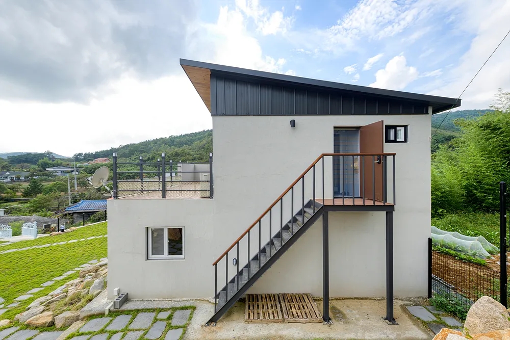 必须使用外部楼梯从较低的楼层到住宅的较高的楼层。这不是一个非常重要的细节,因为房子的低层被用作仓库。但是如果楼下有一个可居住的区域,这个楼梯可能是房子最负面的特征。光滑的玻璃、黑色框架和二楼屋顶上使用的深色与浅色外墙相协调,给房子一个华丽的外观。虽然房子的设计很简单,但是使用的材料都是高质量的。此外,阳台地板上铺设的防水木地板也适合建筑的完整性。
