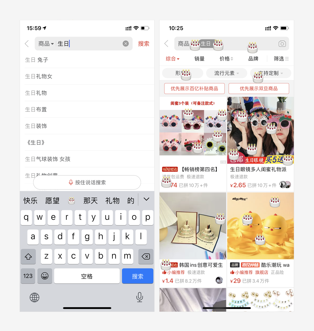 当使用拼多多搜索商品时,如果输入关键词“生日”,点击搜索按钮后,会有生日蛋糕雨从屏幕上方缓缓落下。