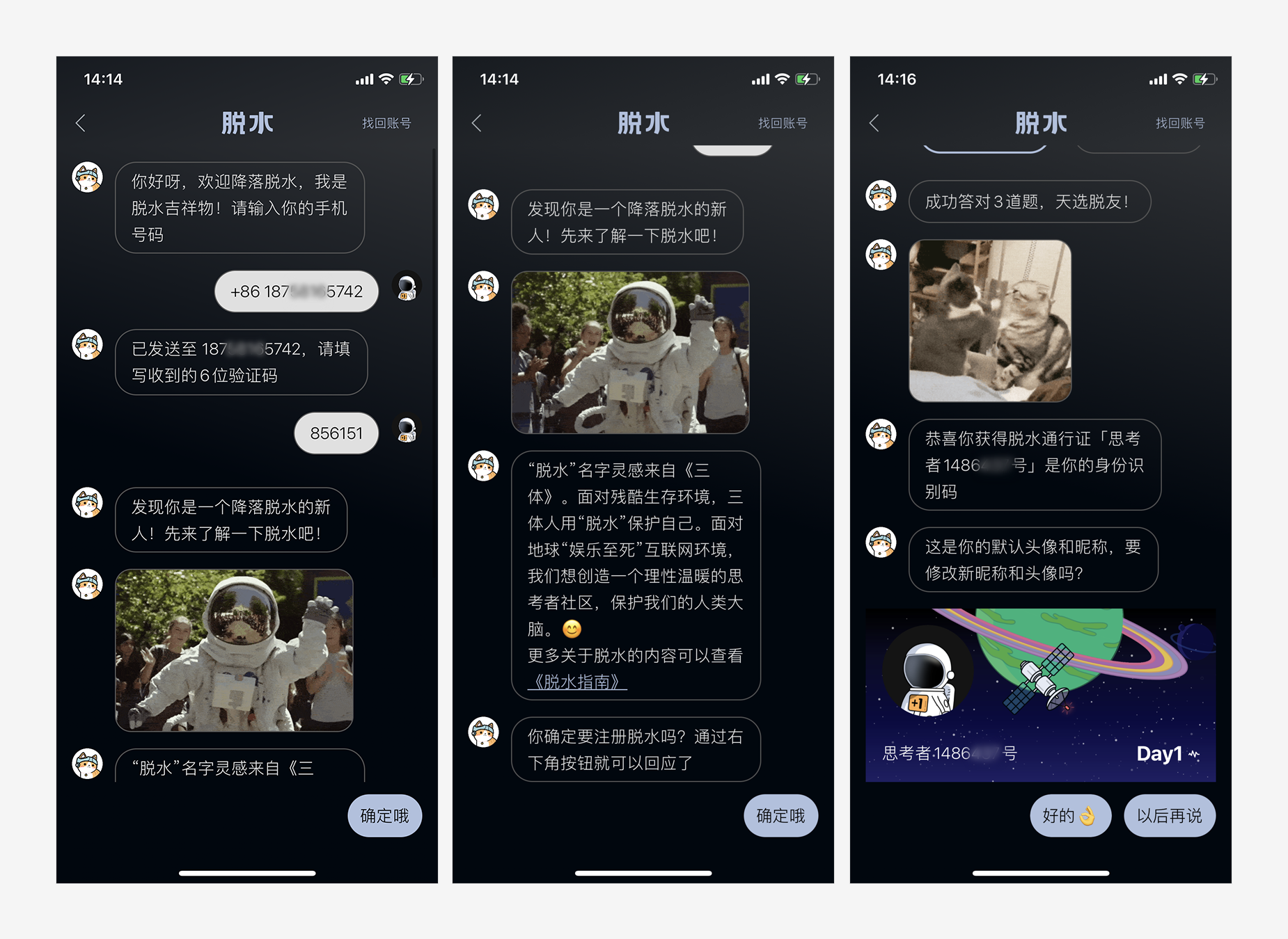 脱水App在用户注册时摒弃传统的注册登录方式,采用了对话框一问一答的方式,完成注册登录动作。