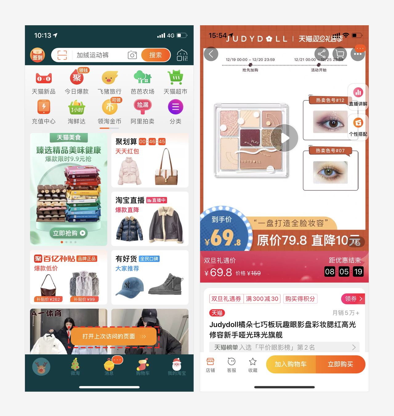 在浏览淘宝App某一个页面时,App意外退出或者退出程序,下次打开淘宝App时,首页底部会跳出提示“打开上次访问的页面”,点击可跳转到退出程序前访问的页面。