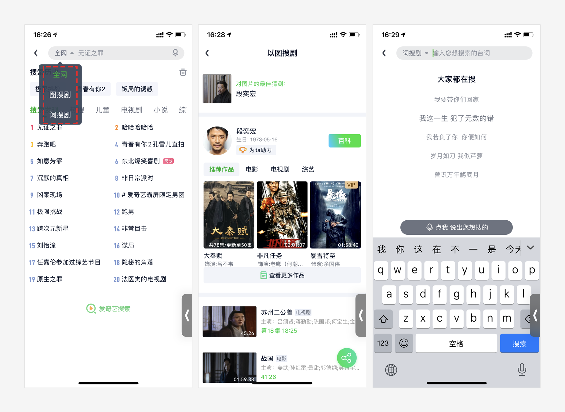 在使用爱奇艺App搜索视频时除了常用的全网搜索、语音搜索外还增加了“图搜剧”、“词搜剧”,用户可以用视频截图或者视频中的台词搜索,以图搜剧较准确,以词搜剧在试了几次台词之后都没法搜出目标剧,准确率很低。