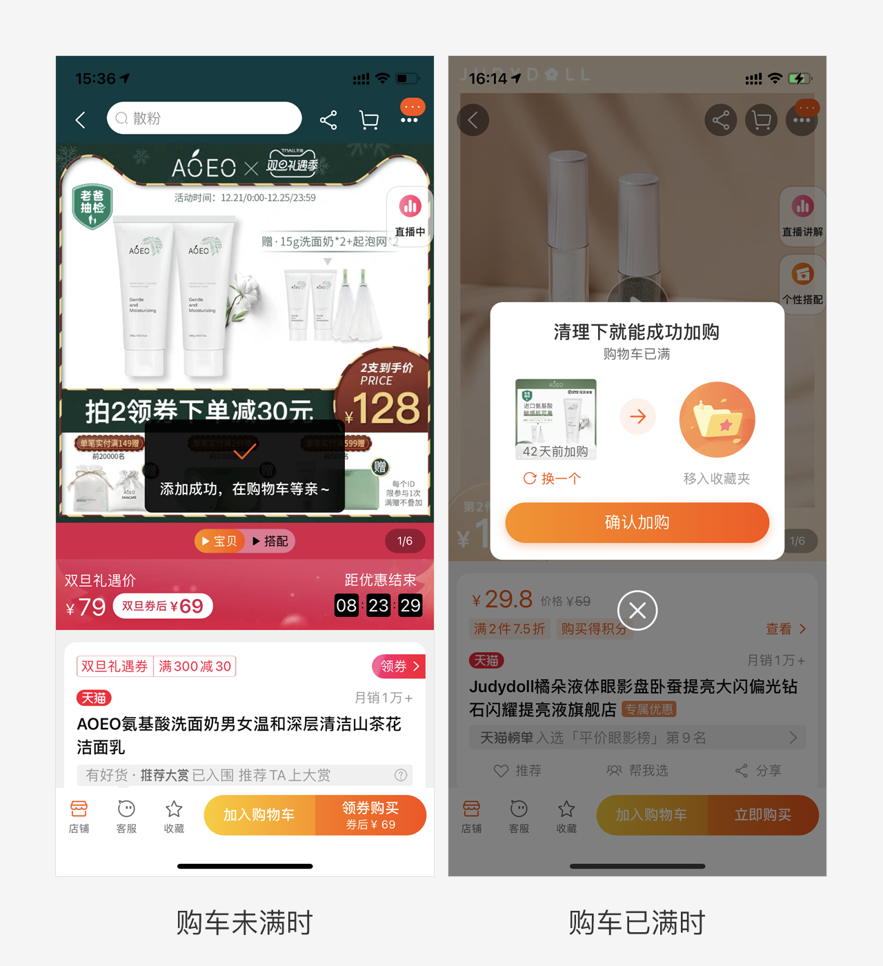 作为一个剁手党来说,你是不是会经常遇到购物车已满的情况,旧版本的淘宝在用户添加商品到购物车但是购物车已满的情况下,app会提示用户去删减购物车内的商品,如果选择删减的话会跳转到购物车页面统一删减,新版本则在用户点击加入购物车按钮后提示用户购物车已满,并弹窗默认某一商品进行替换,用户可以点击“换一下”切换所要替换的购物车中的商品。而且被替换商品并不会删除,用户仍可在收藏夹中查看。