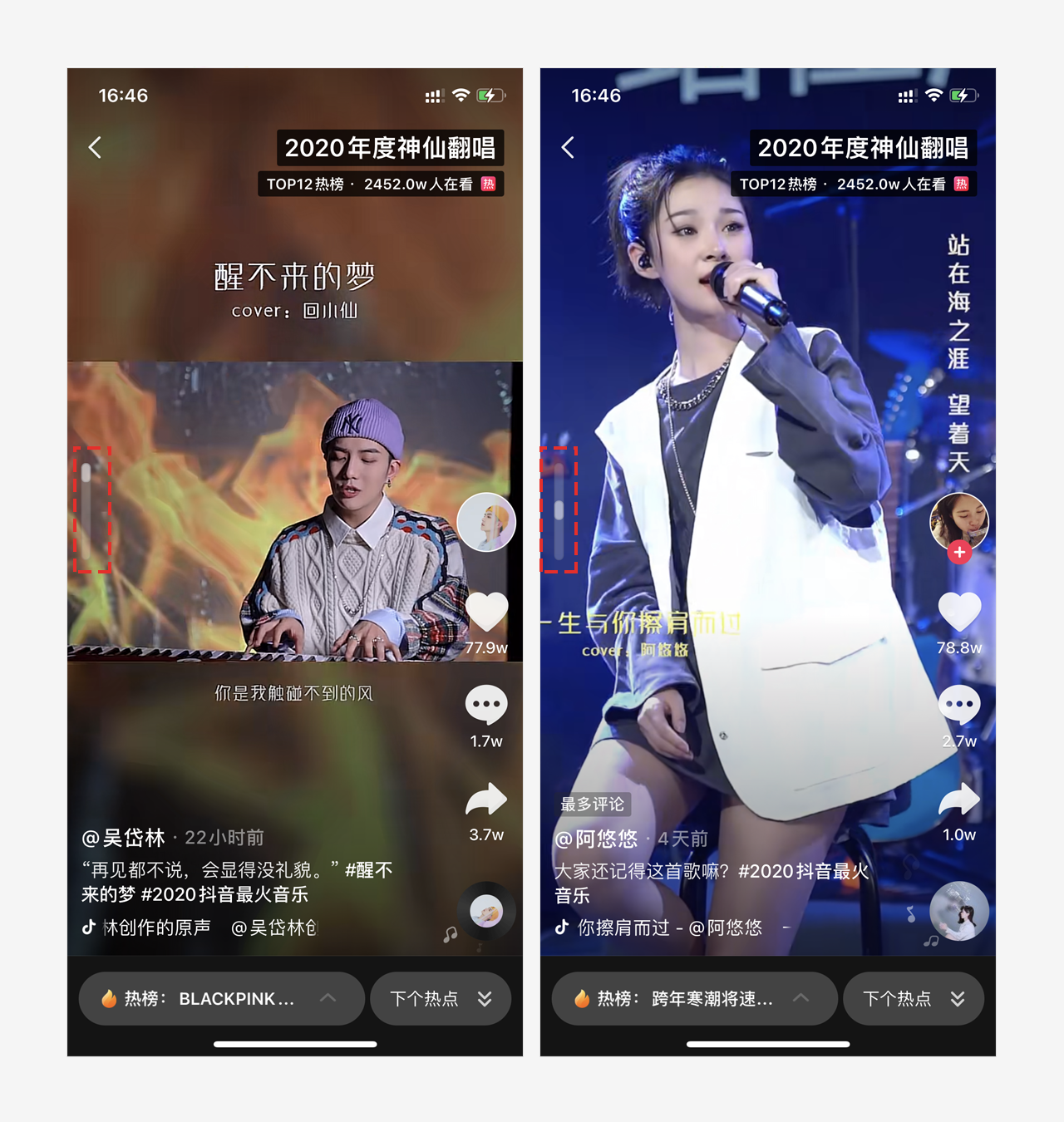 抖音App在浏览某一热点话题视频时,左侧会显示话题视频预览的进度条。随着用户滑动视频浏览新的内容,进度条也会随之往下移动,有类似网页右侧滑块的效果。
