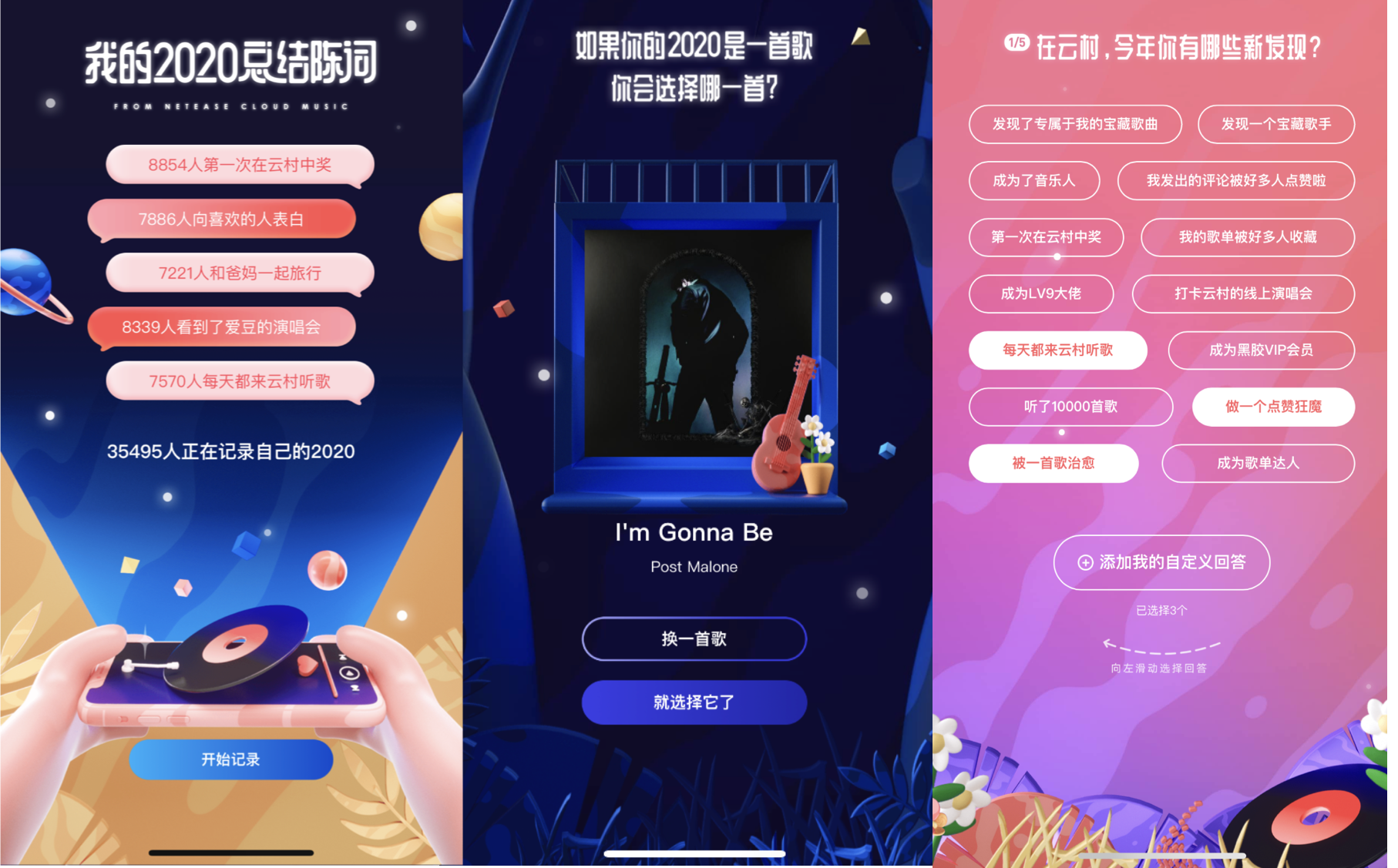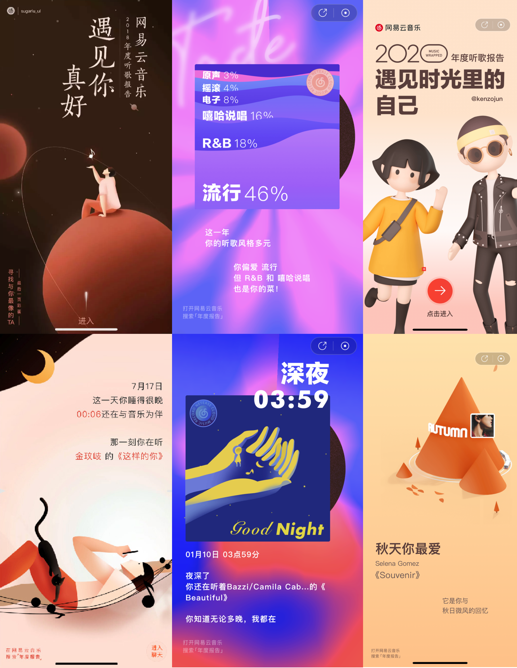 网易云音乐每年的音乐总结报告都追随着最新的设计潮流,今年还可以自由选择人物形象,增强了用户的主观代入感,以下是每年的设计风格变化: