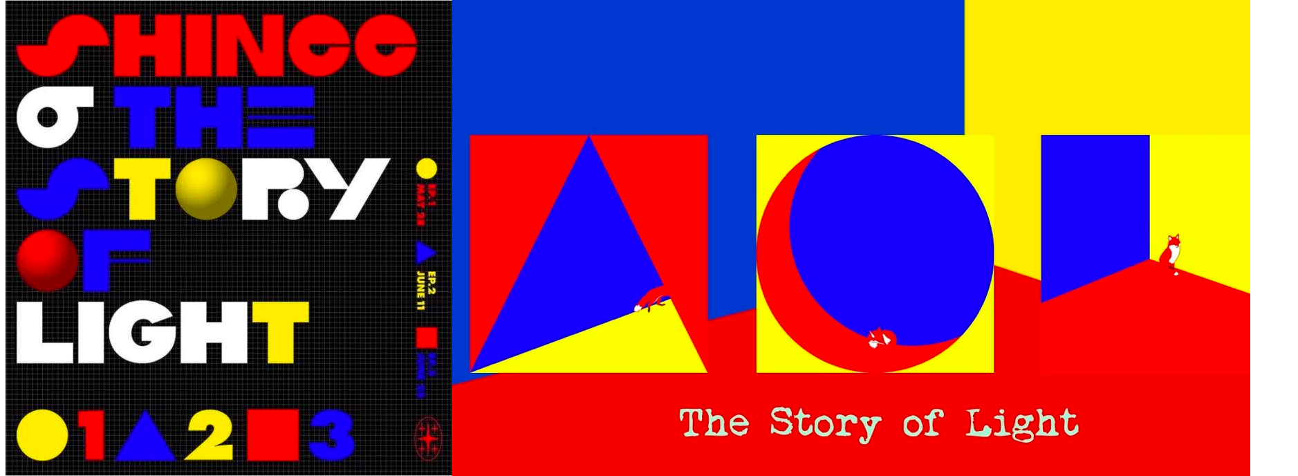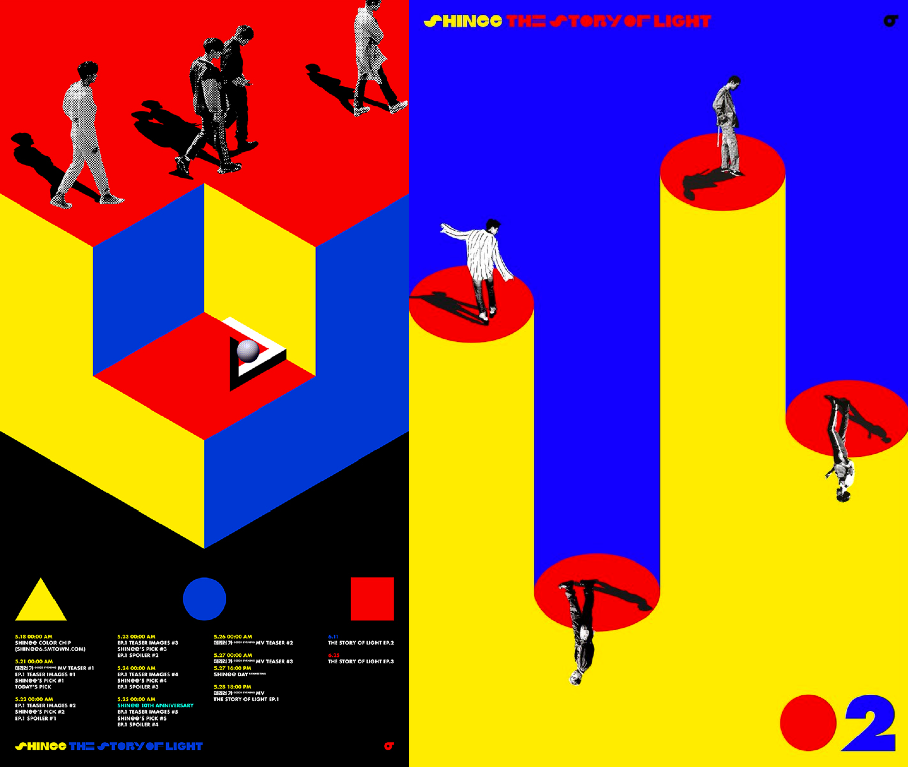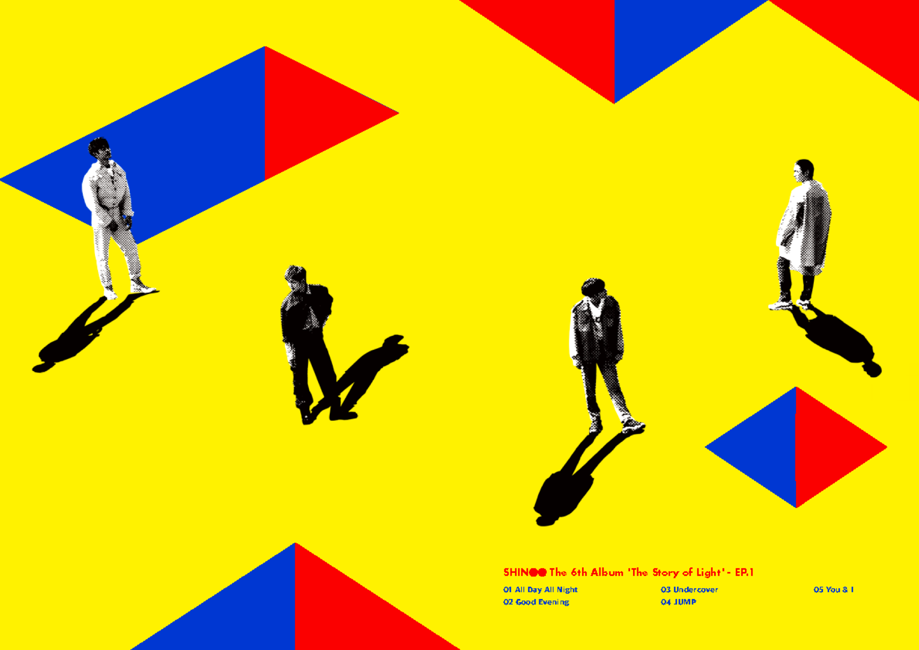 最近看到的一组原色视觉刚好融合了高对比度+几何这两种风格,那就是SHINee的正规六辑合辑《‘The Story of Light’》,采用红黄蓝三色加上圆形、正方形、三角形的大块面积来打造画面空间及变化,带来极具视觉冲击的音乐色彩与魅力。