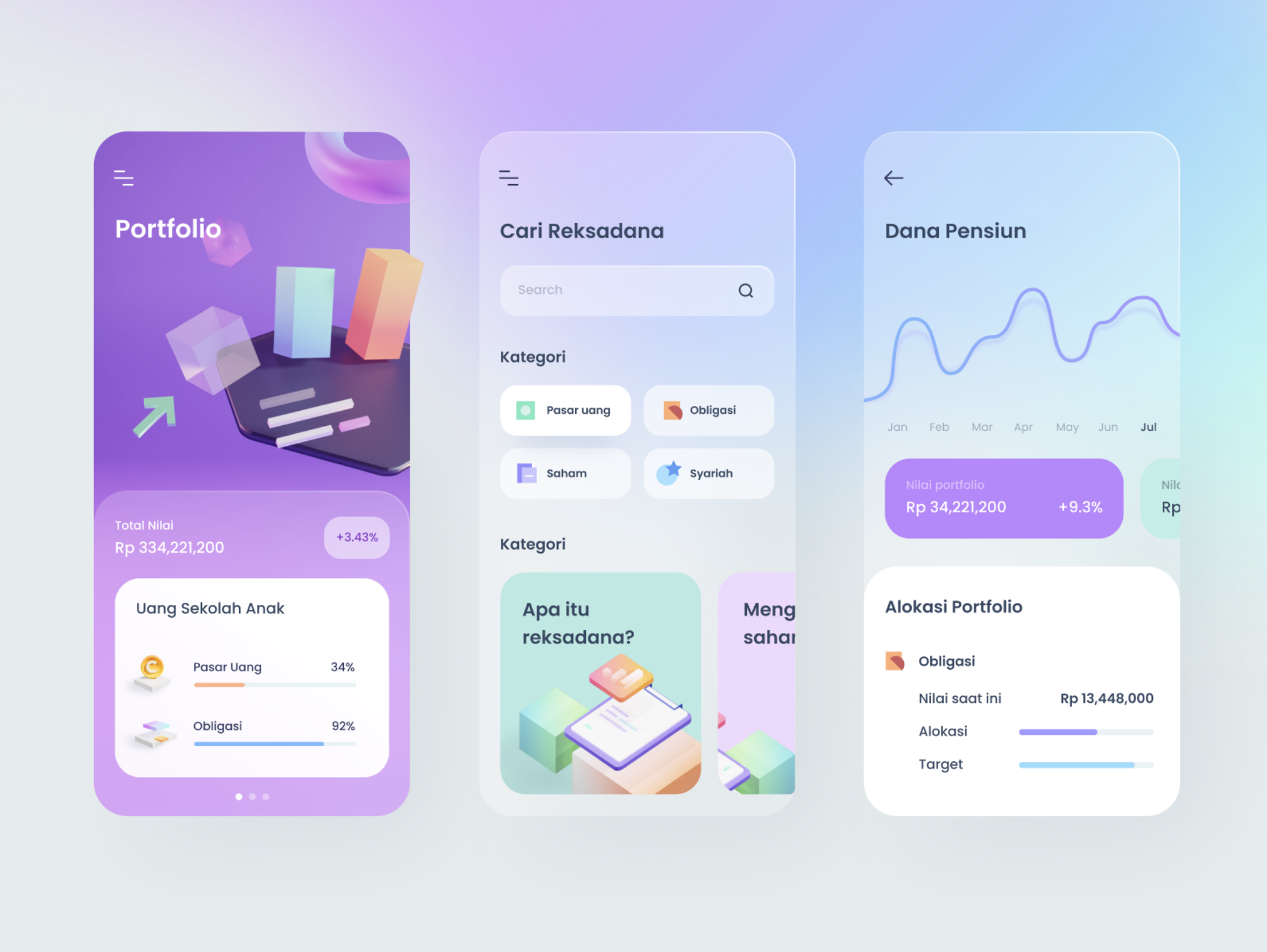 而最新的玻璃拟态则更加注重垂直空间 z 轴的使用,背景多鲜艳色彩,在上空使用隔一层高斯模糊的毛玻璃质感,模糊的边界有细微的浅色边框,整体效果就是让元素之间有虚实结合的特殊空间。毛玻璃运用在界面中对关键信息起到强调作用,用户可以看到物体间的层次关系,哪一层在哪一层之上,就像物理空间中真实的玻璃一样。