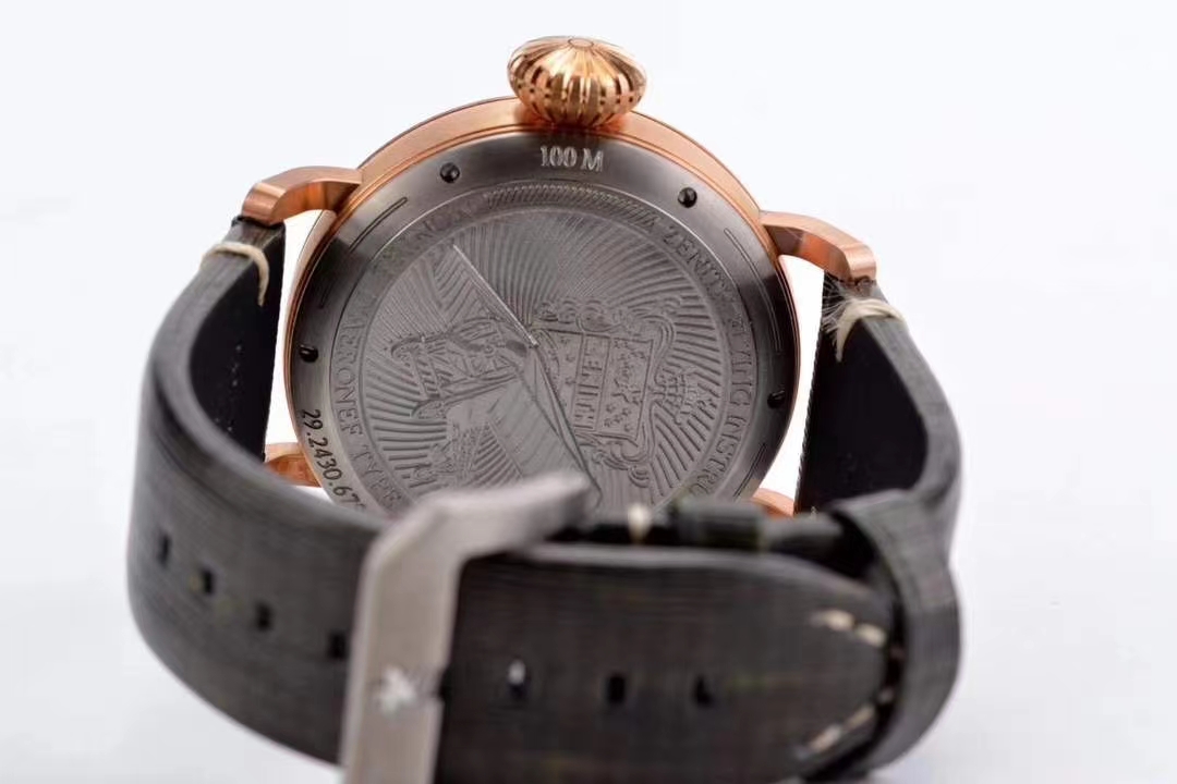 密底设计,底盖上雕刻一架老式飞机的精美图案,意义是为纪念1909年路易·布莱里奥佩戴着真力时手表飞越英吉利海峡的传奇故事。底盖的做工同样很精致细腻,用手触摸可以感触到,在如此大面积图案的雕刻下,依然能够保证后壳的平坦,佩戴舒适。这款腕表的机芯搭载的是西铁城9015机芯,精准稳定。