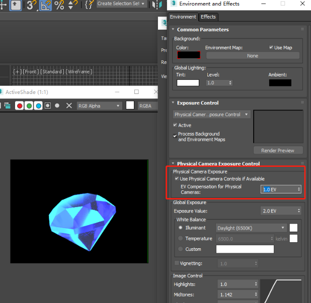 最后说一下,环境里还有一个相机的曝光参数调节,可以控制整体的亮度,比如我把这个值调成1,宝石就会整体亮一些