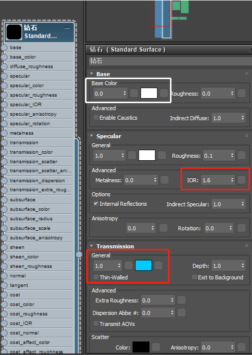宝石材质很简单 主要就是IOR值要大于1.5 Transmission打开到1并给个宝石的基础色,注意Base Color值要归零
