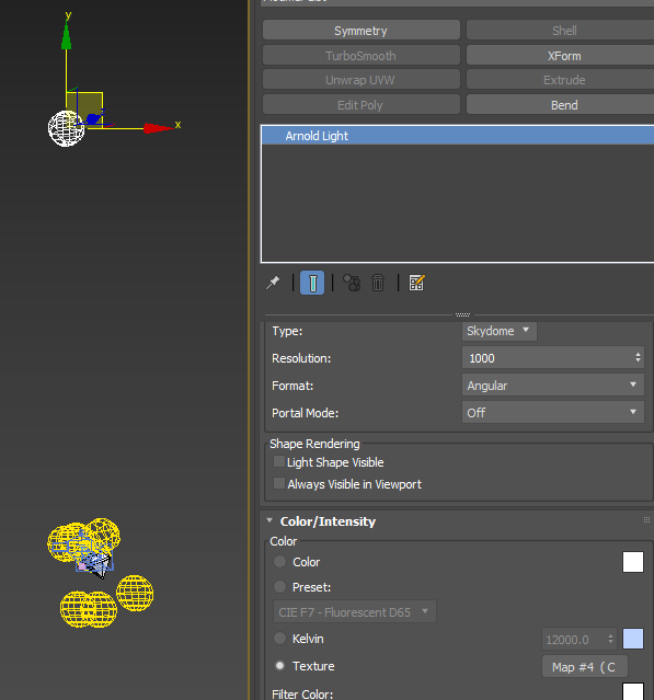 宝石顶端先打一盏skydome的灯光,将调整好的hdr贴图贴到灯的texture里这样就有了基本环境光照,这个灯我给的比较弱(距离远亮度小)主要用来模拟宝石内部折射纹理