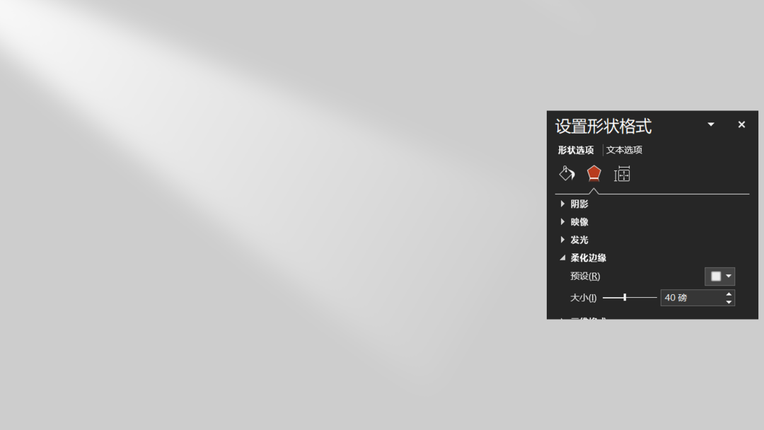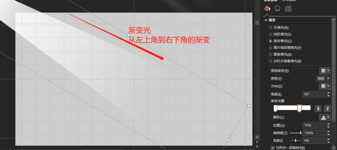 然后把填充色改为渐变填充,注意渐变的角度啊。这时候,做好跟上图一样的效果之后,其实,造光的感觉就已经有了。那还差什么呢?还差一个柔化边缘,把梯形的边缘稍微柔化一下就好啦!