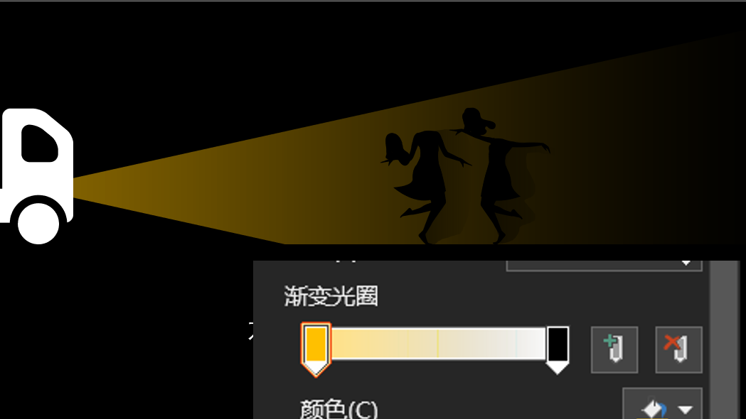 大家看上面两张图,PPT蒙版的渐变取值不同之处在于,渐变光圈的末端都是100%的不透明度,但是,一个是灯光本身的黄色,另一个是背景的黑色,可以很明显的发现,渐变光圈颜色是背景色的黑色图中,灯光的效果更加自然。