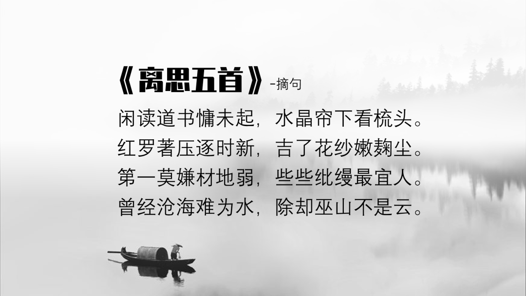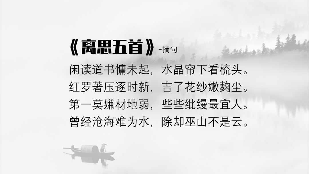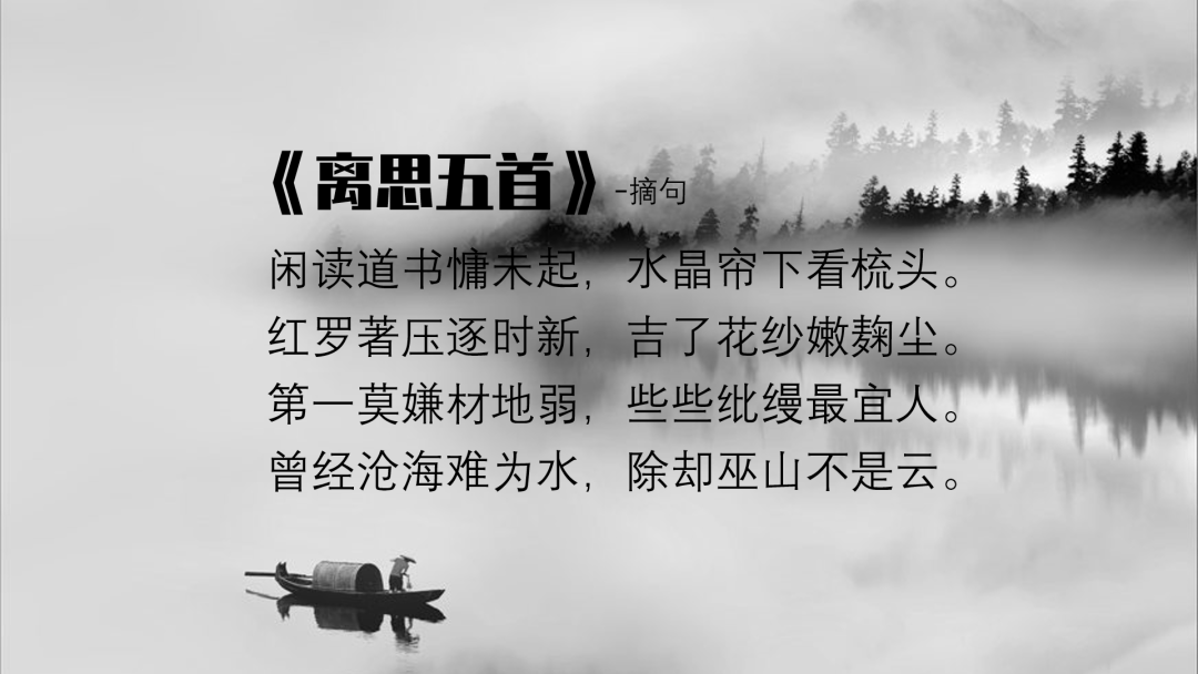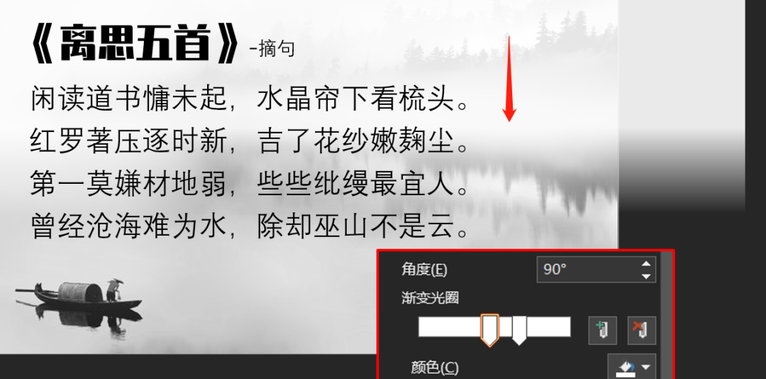 所以大部分情况下,我们都需要掌握那么几个,对图片做处理的小技巧,例如说,上面这页古诗ppt,最大的问题是背景图的山太明显了,导致文案识别困难。