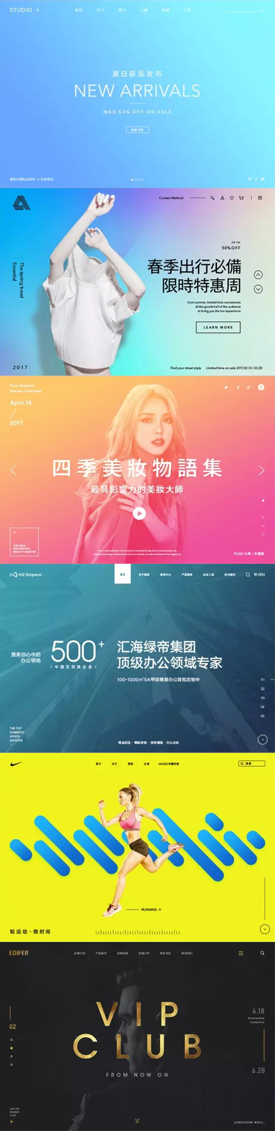 因为渐变蒙版是2种颜色以上的蒙版效果,多种颜色的混搭通常会传达出一种青春活力,比较活跃的气氛,所以通常渐变蒙版,大多会出现在一些购物网页,偏艺术类的设计,以及嘻哈潮流风的使用上。