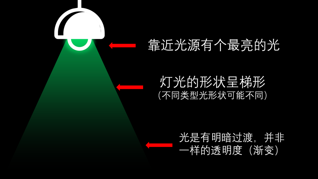 所以光是类似梯形这种由小到大的形状的,这也是为什么,在第一个透射光中,我说要新建的一个梯形,而不是矩形,其次,光是有明暗过渡的,那肯定就是得用渐变填充才行啊~不然的话就非常违背常理了。