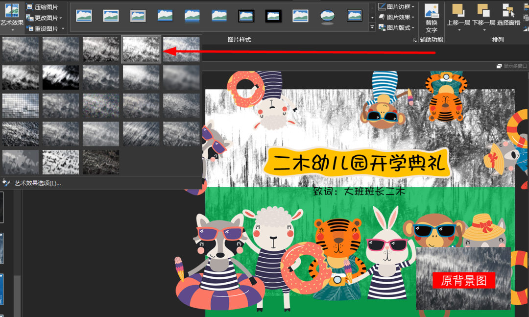 例如像上面这张咱们幼儿园开学典礼的ppt封面,底部的背景图,你知道是用了哪一张吗?其实就是上面一直重复在用的配图,然后叠加了一个铅笔素描的艺术效果。