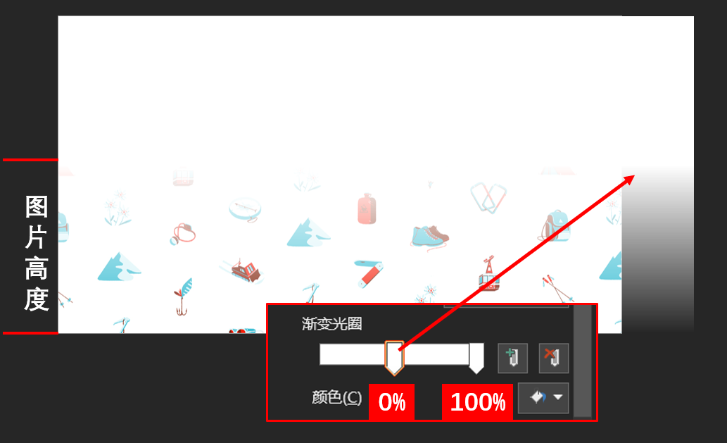 首先呢,在图片上叠加一个矩形,并且填充颜色改为渐变色,接着把渐变属性改为下图这样: