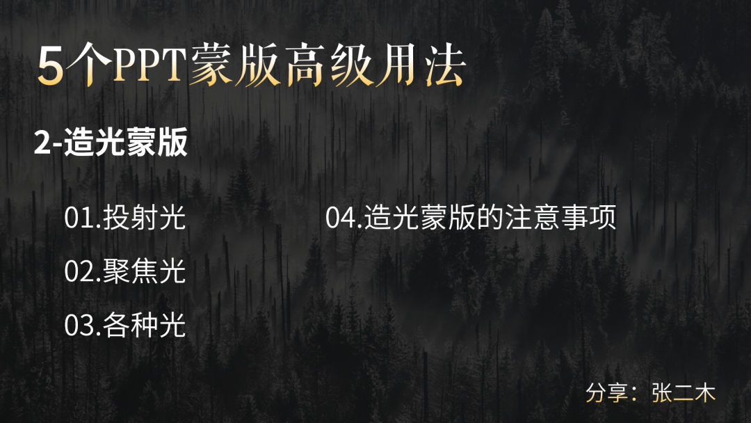 造光蒙版从字面意思上理解是创造光源的意思,那在PPT当中可以怎么用呢?我之前做了一个非常典型的案例,利用造光蒙版,做出了投射光的效果。